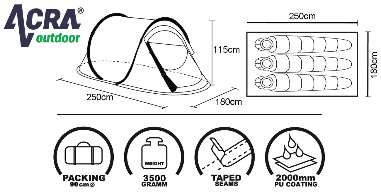 Samostavěcí stan pro 3 osoby. Jedná se o velmi skladný a jednoduše postavitelný stan. Navléknuté sklolaminátové pruty po vyndání z obalu stan kompletně postaví. Pak už jen stačí stan upevnit kolíky k zemi a dopnout plášť stanu kotvícími šňůrami kolem dokola. Demontáž je dobré provádět podle návodu, aby nedošlo k polámání sklolaminátových průtů.
