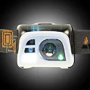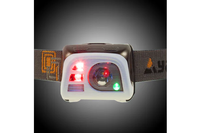 Svítilna YATE VEGA AKU je vybavena třemi světelnými zdroji: výkonnou diodou 3W XPE (140 lm), dvěma červenými LED diodami a bílou SMD LED, která bohatě stačí na chůzi a významně šetří baterii. Stav baterií indikuje zelená LED dioda vpravo dole. Odolná proti stékající vodě.