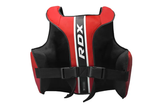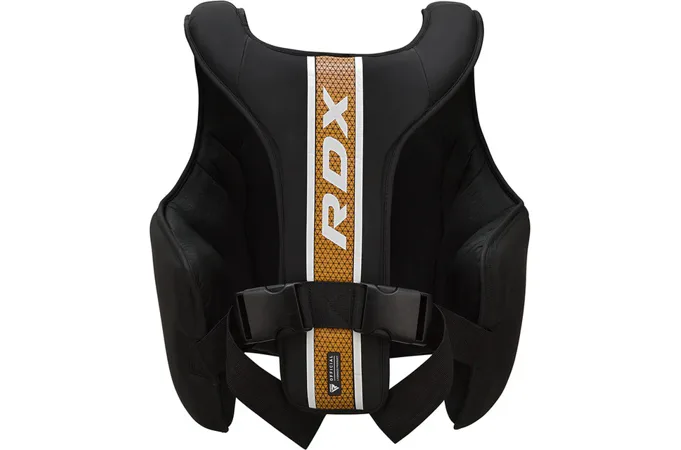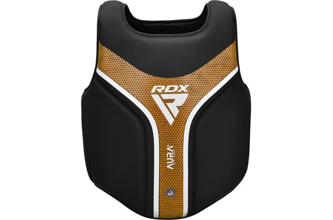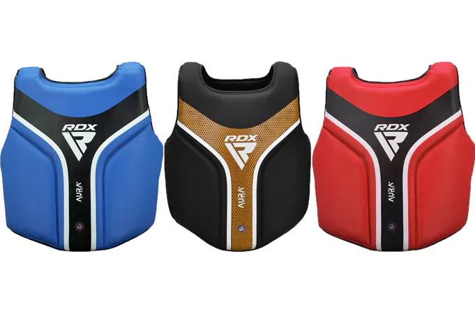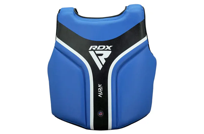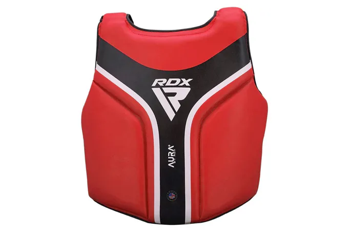 Chránič hrudi RDX AURA plus T-17 je ideální ochranný prvek pro boxery a bojovníky, kteří potřebují spolehlivou ochranu hrudníku při tréninku. Vyrobený z odolné Maya Hide™ kůže, poskytuje dlouhou životnost a odolnost vůči opotřebení. Ergonomický design zajišťuje pohodlné nošení a správné uchycení, zatímco kvalitní tlumící materiál absorbuje nárazy, čímž chrání před zraněním. Díky ventilačním otvorům zůstává komfortní i při intenzivním tréninku. Systém „Quick-EZ“ umožňuje snadné a bezpečné zapnutí.
