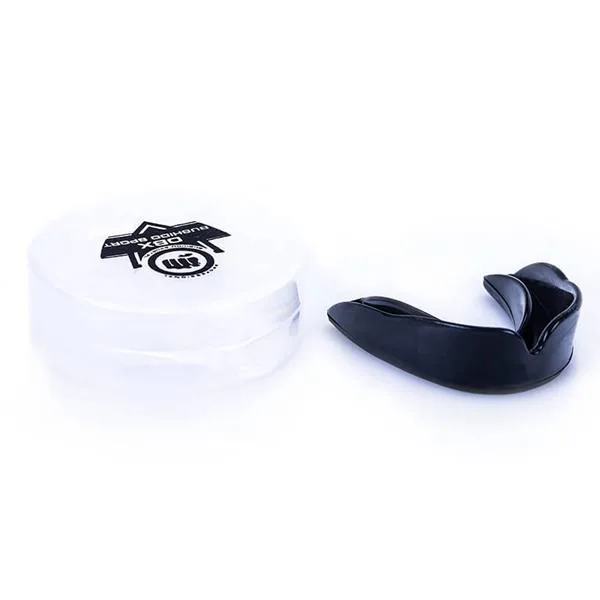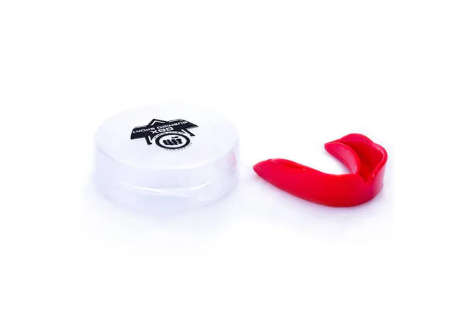 Chránič na zuby DBX BUSHIDO. Chránič se nasazuje na horní patro. Chránič je velmi přizpůsobivý tvaru čelisti, nepřekáží v dýchání, neomezuje v mluvení a nezvyšuje slinění. Chránič se prodává v plastové krabičce.