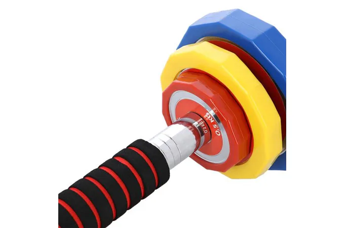 Činky jsou vyrobeny z vysoce kvalitní chromované oceli, která je zárukou dlouhé životnosti. Kotouče jsou pokryty vrstvou PVC, které chrání jak podlahu, tak samotné kotouče před poškozením v případě nechtěného upuštění činky. Kotouče se proti posunutí zajišťují šroubovacími zámky, které jsou dodatečně jištěny šroubem s křídlovou matkou.