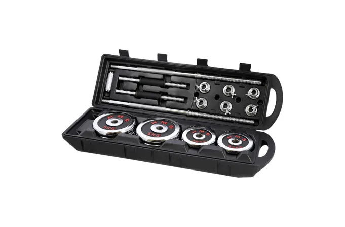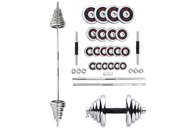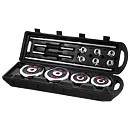 Obouruční osu tvoří tři části, v podstatě jde o 2 poloviny, které se našroubují do středního vroubkovaného dílu, tím nám vznikne klasická obouruční osa, která se od pevné hřídele liší pouze nepatrně širším středem. Sada HMS STC50 je prvním modelem z naší nabídky, který umožňuje toto řešení, které šetří náklady a místo ve vaší domácí posilovně. Sada obsahuje 2 krátké nakládací osy opatřené ergonomickým úchopem, 2 části obouruční osy, spojovací díl, 6 zámků a 20 kotoučů.