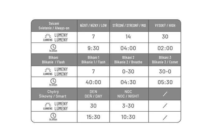 Díky světelnému kuželu v rozsahu 230° budete vidět až na vzdálenost 800 metrů. Obě světla ze sady Crussis CRS 30 mají více režimů svícení včetně režimu nízské spotřeby.