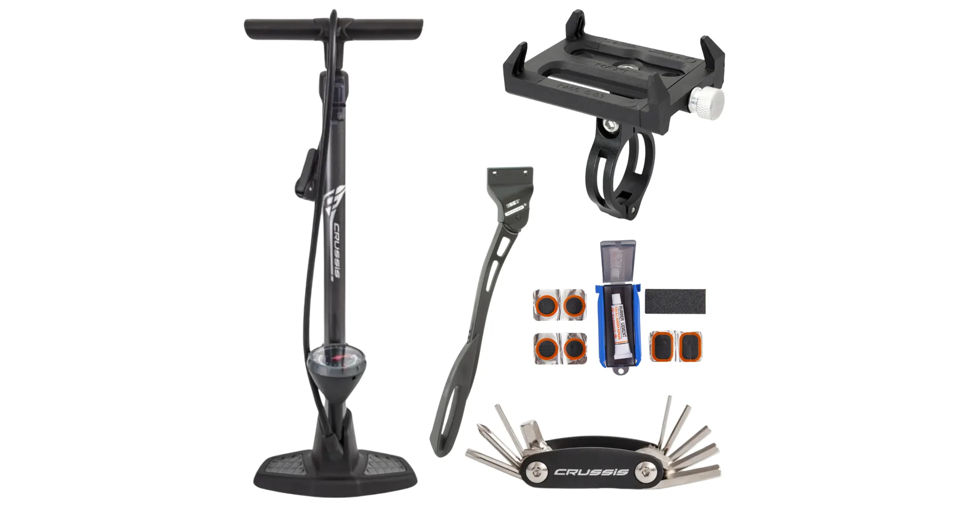 Praktická sada originálního příslušenství CRUSSIS obsahuje vše, co ocení každý cyklista na cestách. Od základní údržby přes huštění pneumatik až po bezpečné odstavení kola nebo uchycení telefonu.