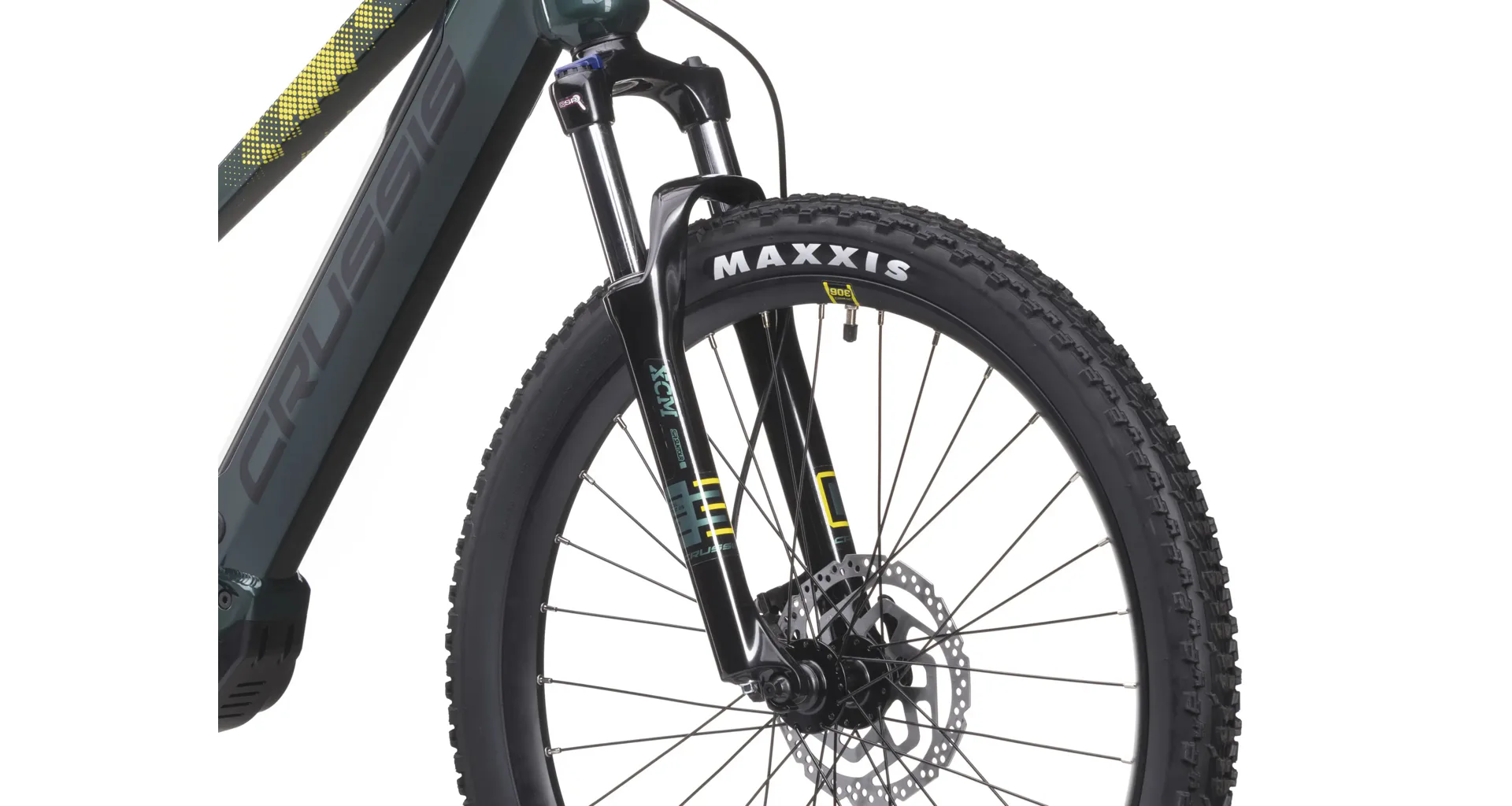 Crussis e-Atland 6.10 je vybaveno odpruženou vidlicí s pružinovým tlumením SUNTOUR XCM32 NLO DS 29" se zdvihem 100 mm, která je skvěle přizpůsobivá váze cyklisty.