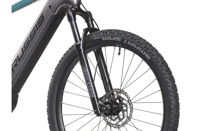 Crussis e-Atland 9.10 je vybaveno odpruženou vidlicí se vzduchovým tlumením ROCKSHOX FS Judy Silver TK Solo Air 27,5" se zdvihem 100 mm, která je skvěle přizpůsobivá váze cyklisty.