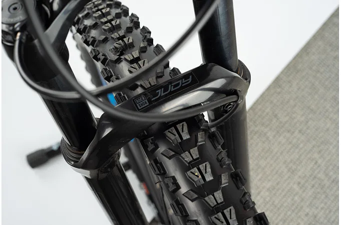 Crussis e-Atland 9.7 je vybaveno odpruženou vidlicí s pružinovým tlumením ROCKSHOX FS Judy Silver TK Solo Air 27,5" se zdvihem 100 mm, která je skvěle přizpůsobivá váze cyklisty.