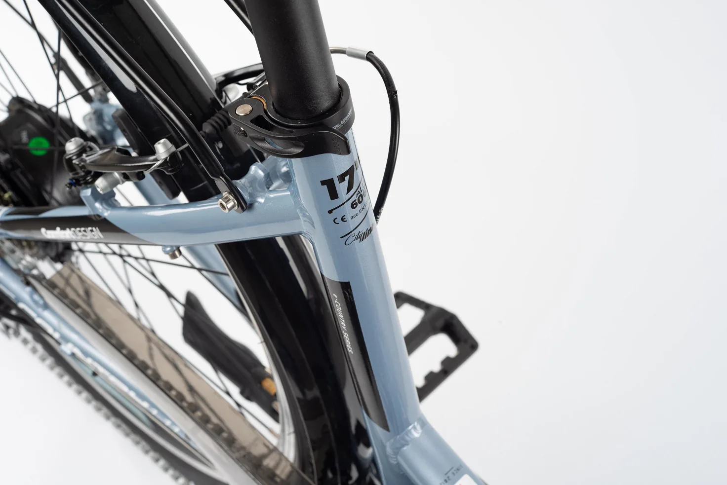 Model disponuje 17" rámem s moderním designem z hliníku, baterií integrovanou v rámu a výkonným pohonem v zadním náboji kola.