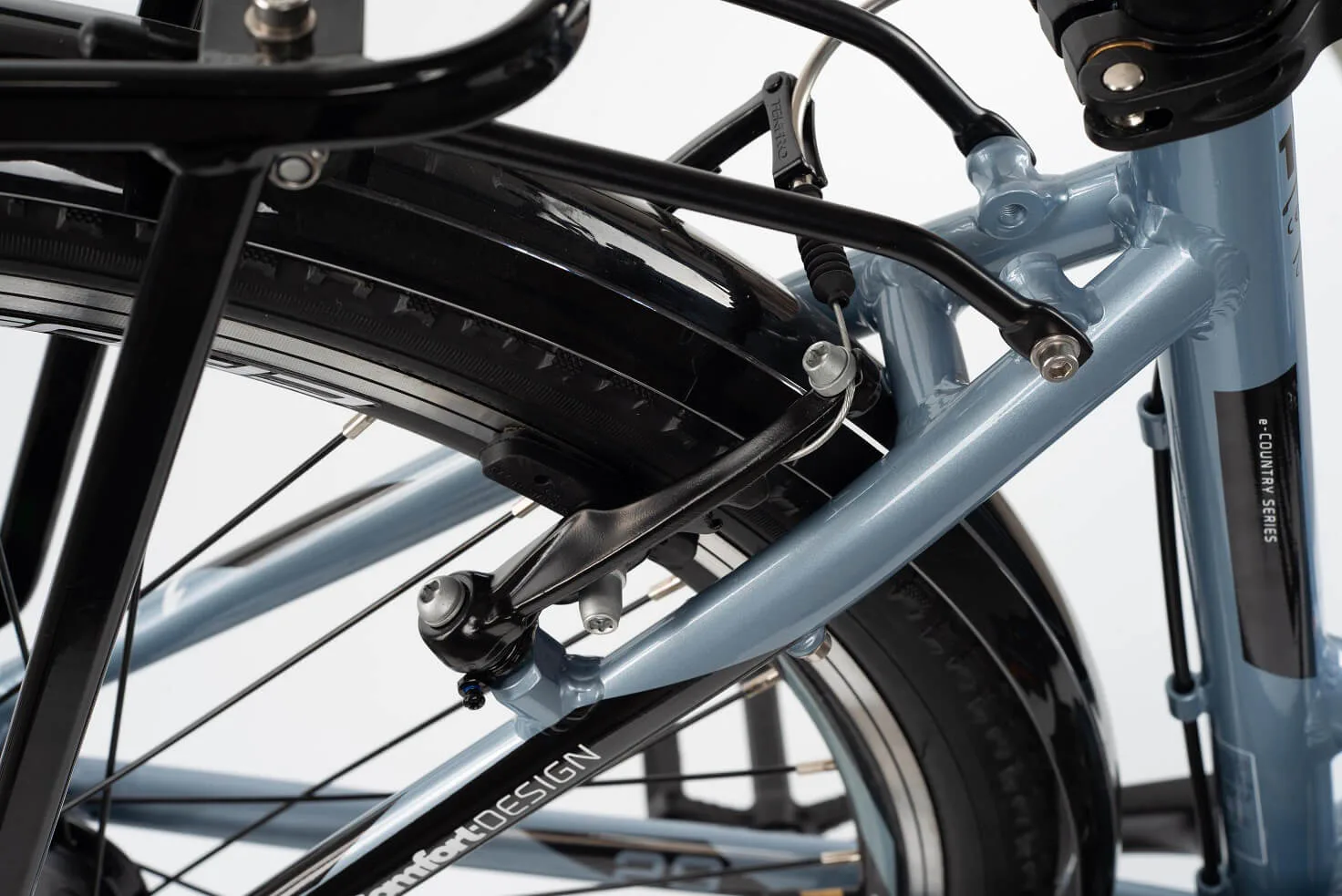 Městské kolo e-Country 1.11 je vybaveno předním i zadním blatníkem. Součástí je zadní nosič, který lze vybavit brašnou nebo košíkem.
