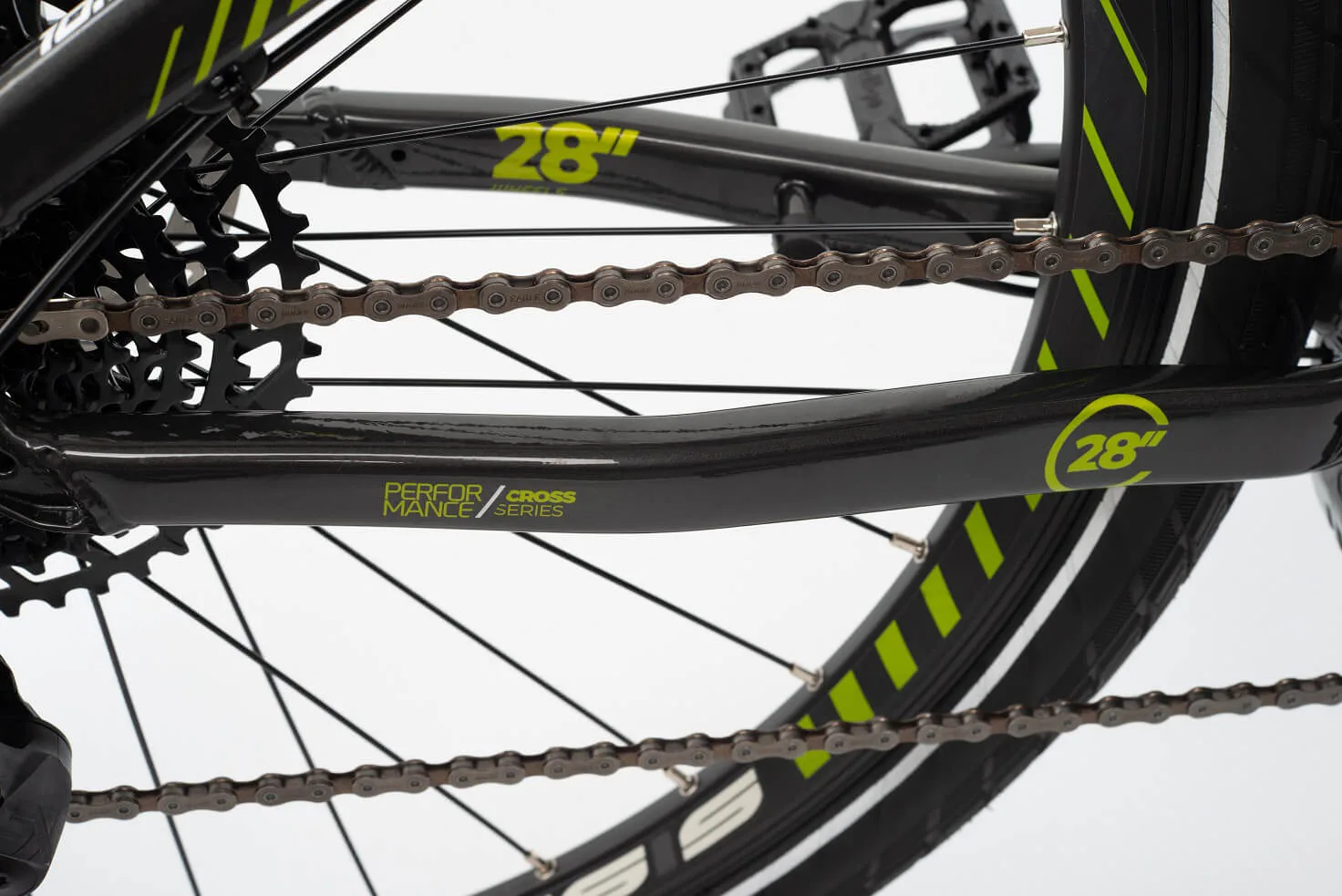 Komfort zajišťuje vyladěná geometrie a také bohatá základní výbava s odpruženou vidlicí s pružinovým tlumením, kotoučovými brzdami a stabilními 28“ zapletenými koly.