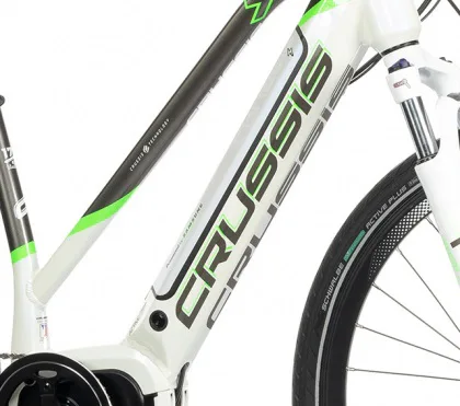 Model CRUSSIS e-Cross lady 7.7 patří mezi oblíbená treková elektrokola značky CRUSSIS určené především pro dámy! Vyniká především svoji integrovanou baterii přímo v rámu, takže není nijak narušený design kola a zajišťuje maximální komfort a ovladatelnost při jízdě jak v nízké, tak i vysoké rychlosti. Kapacita baterie se liší dle zvolené varianty – základní (14,5 Ah) nebo S (17,5 Ah), M (20 Ah), L (25 Ah).