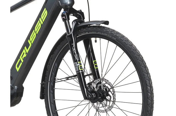 Crussis e-Gordo 7.10 je vybaveno odpruženou vidlicí s pružinovým tlumením SUNTOUR NEX HLO DS 700c se zdvihem 63 mm, která je skvěle přizpůsobivá váze cyklisty.