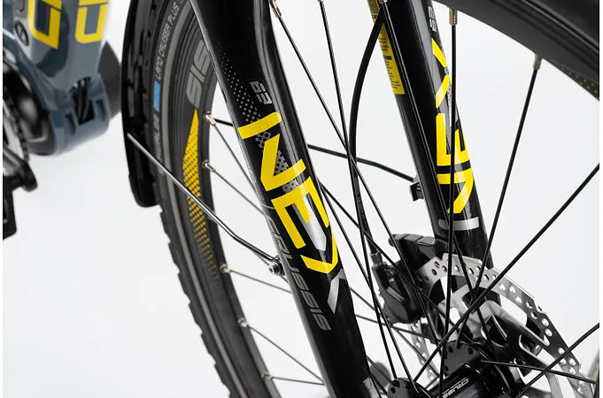 CRUSSIS e-Gordo 7.7 je vybaveno odpruženou vidlicí s pružinovým tlumením SUNTOUR NEX HLO DS 700c se zdvihem 63 mm, která je skvěle přizpůsobivá váze cyklisty.