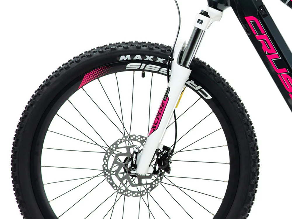 Komfort zajišťuje vyladěná geometrie a také bohatá základní výbava s odpruženou vidlicí s pružinovým tlumením, kotoučovými brzdami a stabilními 27,5“ zapletenými koly.