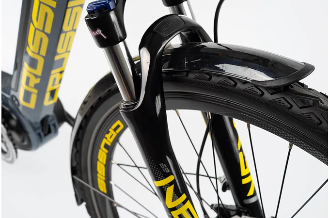 CRUSSIS e-Savela 7.7 je vybaveno odpruženou vidlicí s pružinovým tlumením SUNTOUR NEX HLO DS 700c se zdvihem 63 mm, která je skvěle přizpůsobivá váze cyklisty.