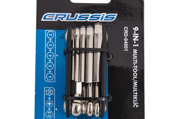 Multiklíč CRUSSIS s 9 funkcemi je praktický pomocník pro každého cyklistu, který chce mít základní nářadí vždy po ruce. Ideální pro drobné opravy a seřízení kola přímo v terénu. Díky pevné konstrukci, kompaktním rozměrům a nízké hmotnosti se snadno vejde do kapsy, brašny nebo batohu.