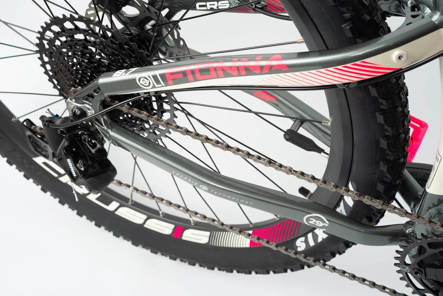 CRUSSIS OLI Fionna 8.7 je vybaveno odpruženou vidlicí s pružinovým tlumením ROCKSHOX FS Judy Silver TK Solo Air 29" se zdvihem 100 mm, která je skvěle přizpůsobivá váze cyklisty.