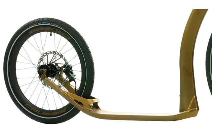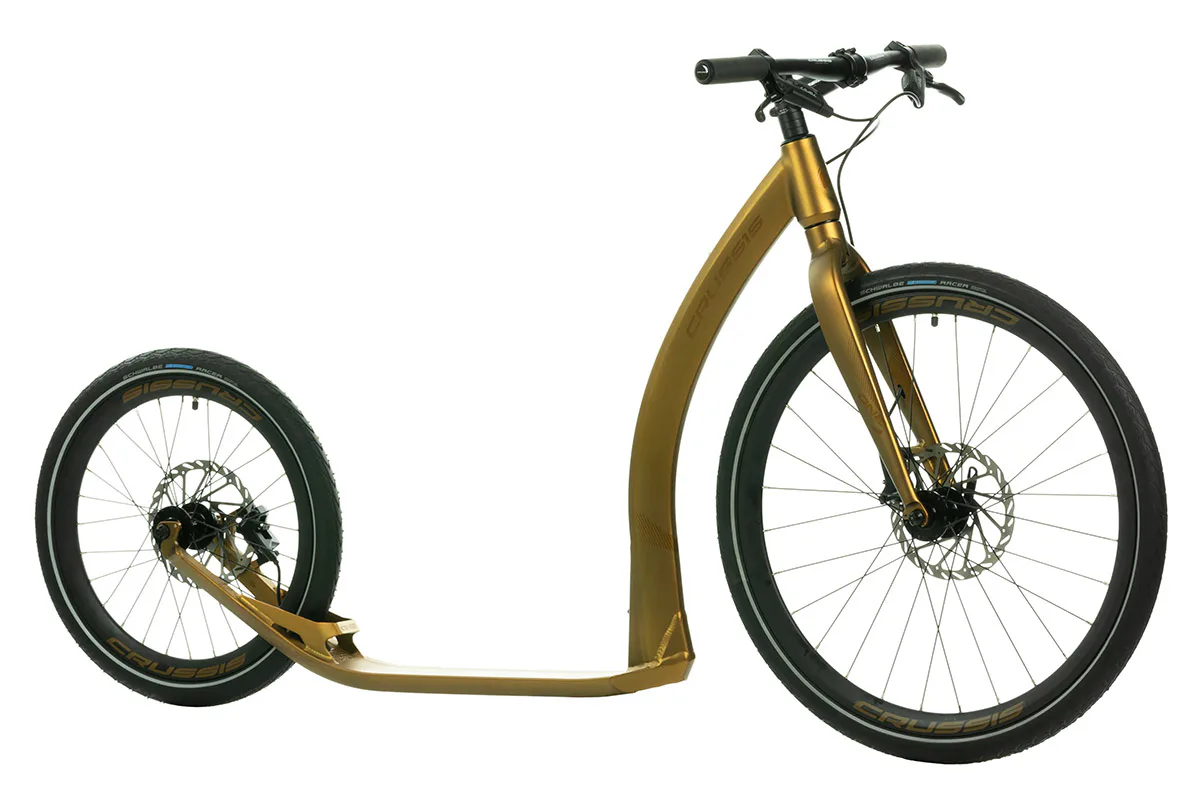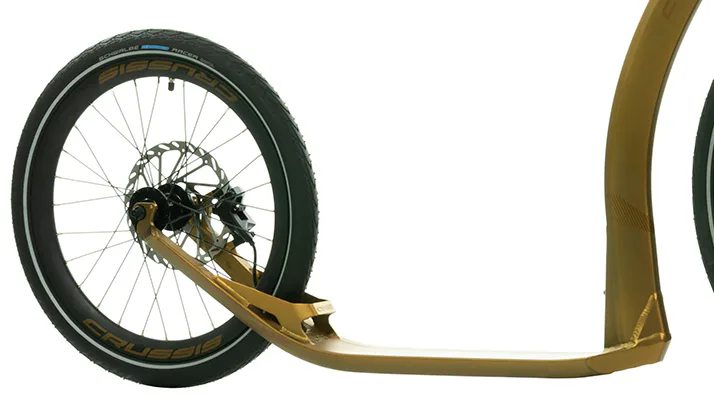 Unikátní hliníkový rám koloběžek Crussis ONE Cobra Sport 4.2-5 byl vyvinut tak, aby se zadní vidlicí tvořil jeden celek. To eliminuje únavové lomy v místech, kde je vidlice ke stupátku obvykle přivařena. Kónický tvar hlavové trubky spolu s trojúhelníkovým profilem krku zvyšuje pevnost rámu.