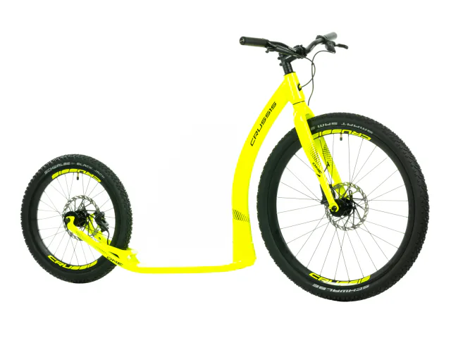 Unikátní hliníkový rám koloběžek Crussis ONE Cross Hard byl vyvinut tak, aby se zadní vidlicí tvořil jeden celek. To eliminuje únavové lomy v místech, kde je vidlice ke stupátku obvykle přivařena. Kónický tvar hlavové trubky spolu s trojúhelníkovým profilem krku zvyšuje pevnost rámu.