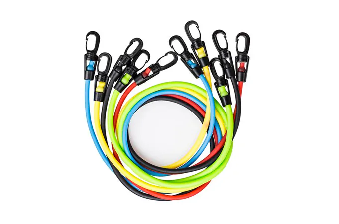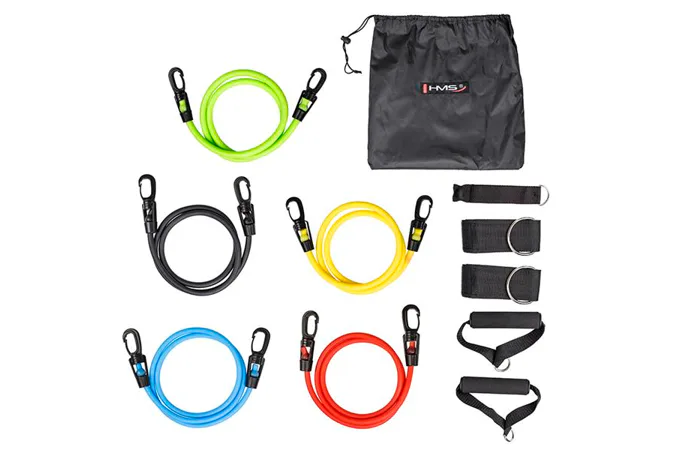 Cvičební gumy (expandery) - sada je ideální pro trénink s odporem s možností tuhosti expanderu. HMS TX30 obsahuje: 5x odporová guma, 2 - úchyty na ruce, 2 - úchyty kotníku, 1 - upevnění na dveře. Každá dvojice gum má jinou tuhost, která vám umožní vybrat různé úrovně intenzity cvičení. Na každé z gum může být rukojeť, což umožňuje realizaci komplexního tréninku všech svalových skupin.