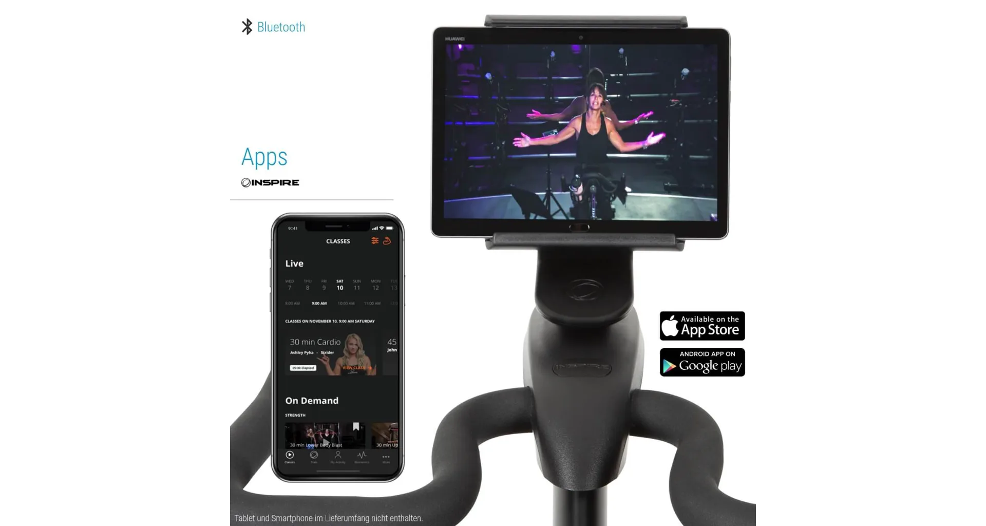 Během cvičení můžete měřit tepovou frekvenci pomocí hrudního pásu (není součástí balení). Navíc si můžete na řídítka umístit svůj smartphone, a to díky praktickému držáku, a sledovat fitness aplikace zvyšující vaši motivaci. Smartphone také můžete provázat s aplikací Inspire Fitness a sledovat reálnou trasu pro ještě mimořádnější trénink (aplikace Inspire Fitness je propojena s trenažérem a zobrazuje vám rychlost, čas šlapání, spálené kalorie, ujetou vzdálenost, frekvenci otáček atp.).