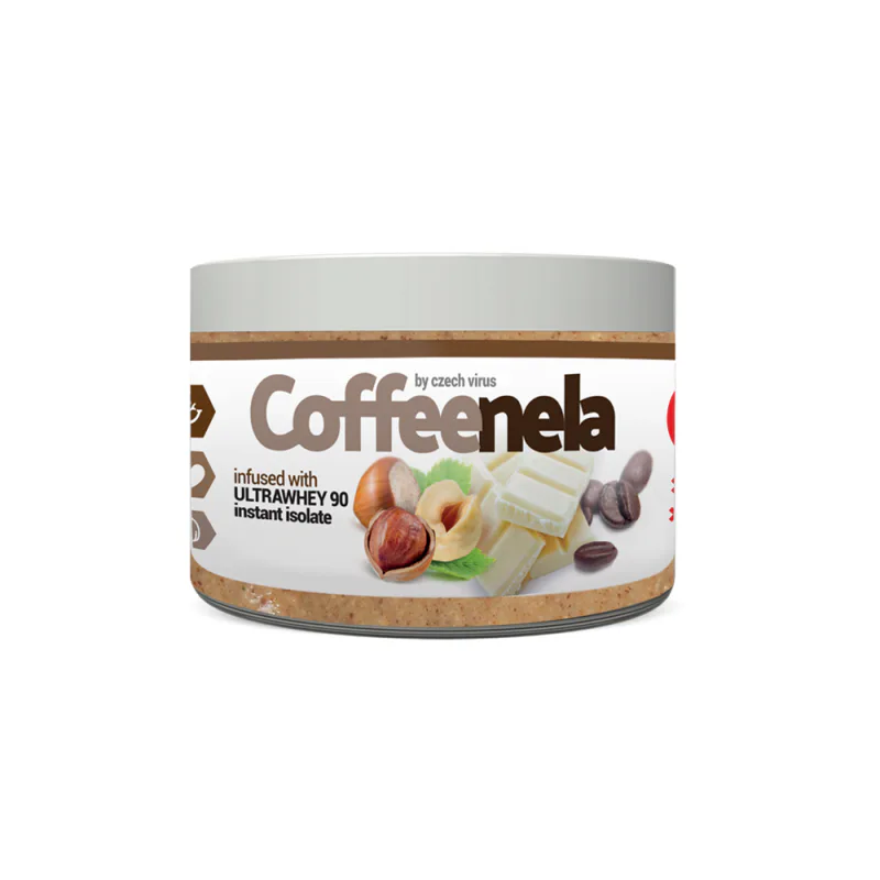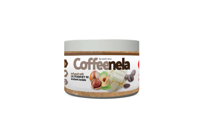 Směs lískových ořechů, bílé belgické čokolády, kvalitního proteinu a čerstvé kávy. Coffeenela je výborný zdroj kvalitních živin, hlavně bílkovin a nenasycených tuků s minimem sacharidů. Díky vysokému obsahu bílkovin pomáhá k udržení a růstu svalové hmoty. Je vhodná jako přídavek do proteinového nápoje, palačinek nebo jen tak na lžičku. V produktu naleznete kromě lískových oříšků také syrovátkový izolát (CFM, Ultra Whey 90 Instant), bílou belgickou čokoládu a čerstvě mletou kávu. Vysoce kvalitní složení produkt předurčuje k tomu, abyste ho vyměnili za nezdravé varianty plné bílého cukru a palmového oleje. Jako všechny ořechové krémy značky Czech Virus je Coffeenela vyrobena od A do Z v ČR (Brno) a při pražení není použit žádný tuk