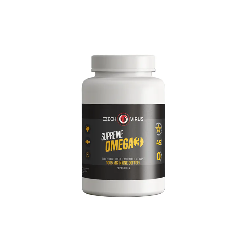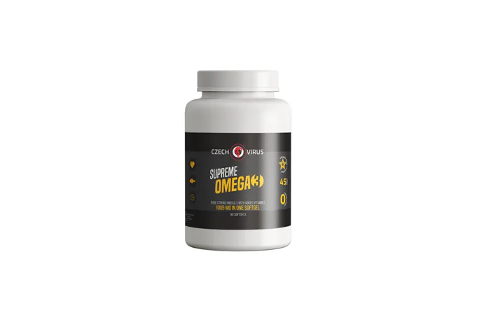 CZECH VIRUS Supreme Omega 3 je vysoce koncentrovaná směs přírodního rybího oleje a přírodního vitamínu E. Poměr EPA a DHA je v tomto produktu vyšší - 33/22. Jedná se tedy o skoro dvojnásobné množství oproti klasický Omegám s poměrem 18/12. Tento produkt je vhodnější pro uživatele vyššího množství omega 3 mastných kyselin, kteří nechtějí užívat třeba až desítky kapslí denně, ale potřebují do sebe dostat hodně EPA (kyselina eikosapentaenová) a DHA (kyselina dokosahexaenová).