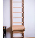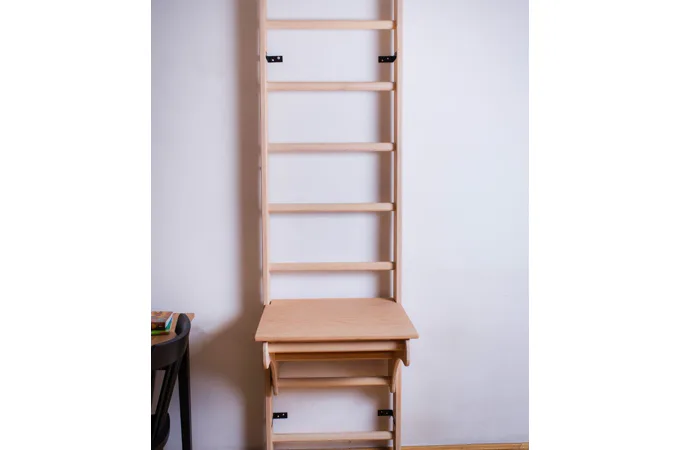 Stoleček umístíte na závěsnou hrazdu, která není součástí balení stejně jako žebřiny, ale můžete si je u nás dokoupit.