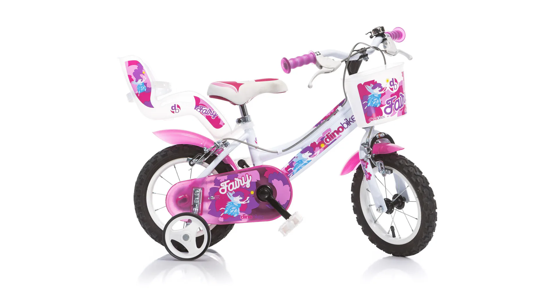 Dino Bikes 126 Fairy má za sedlem plastový nosič na panenky, na řidítkách plastový košíček a také kovový zvonek