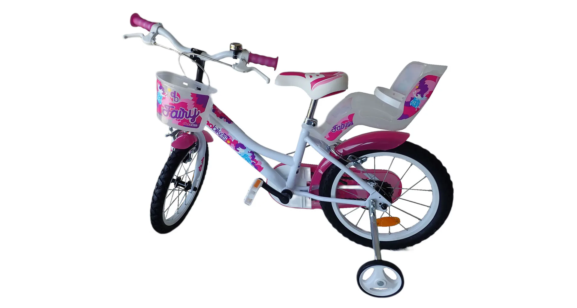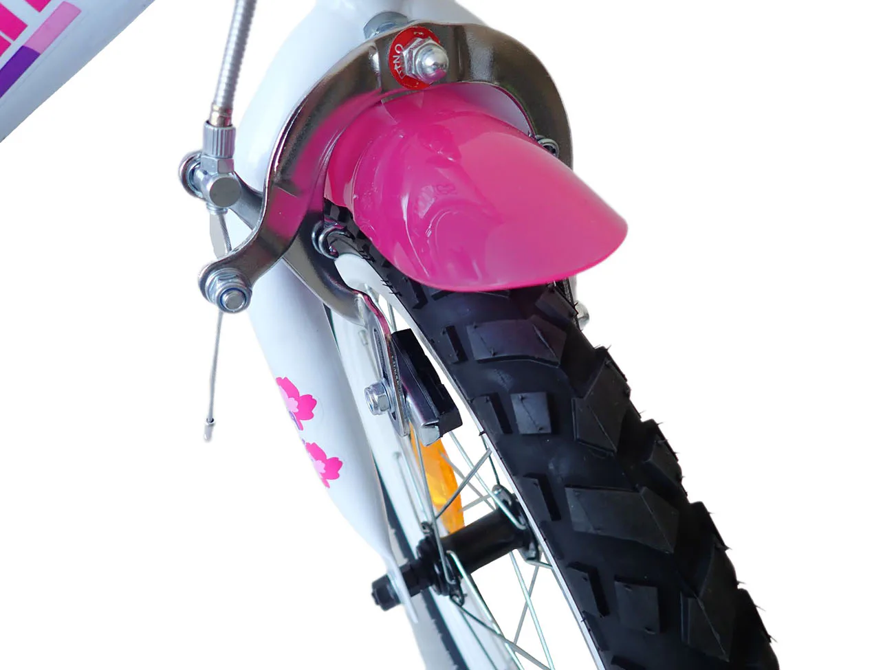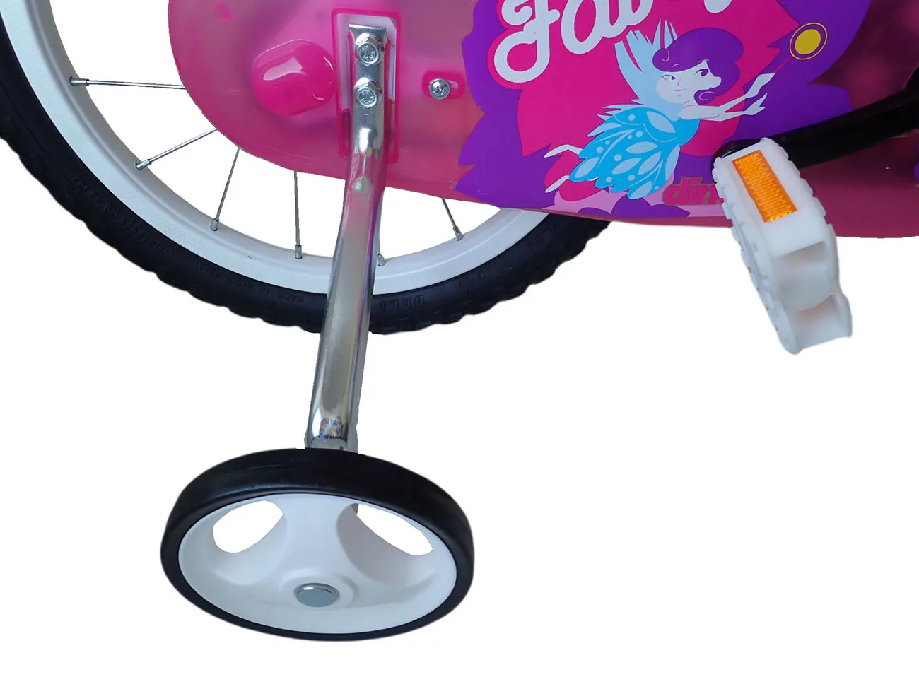 Dětské kolo Dino Bikes 164RN FAIRY má ocelové ráfky 16" (palců = 41 cm), nafukovací pláště, volnoběh a je vybavené přední i zadní čelisťovou brzdou.