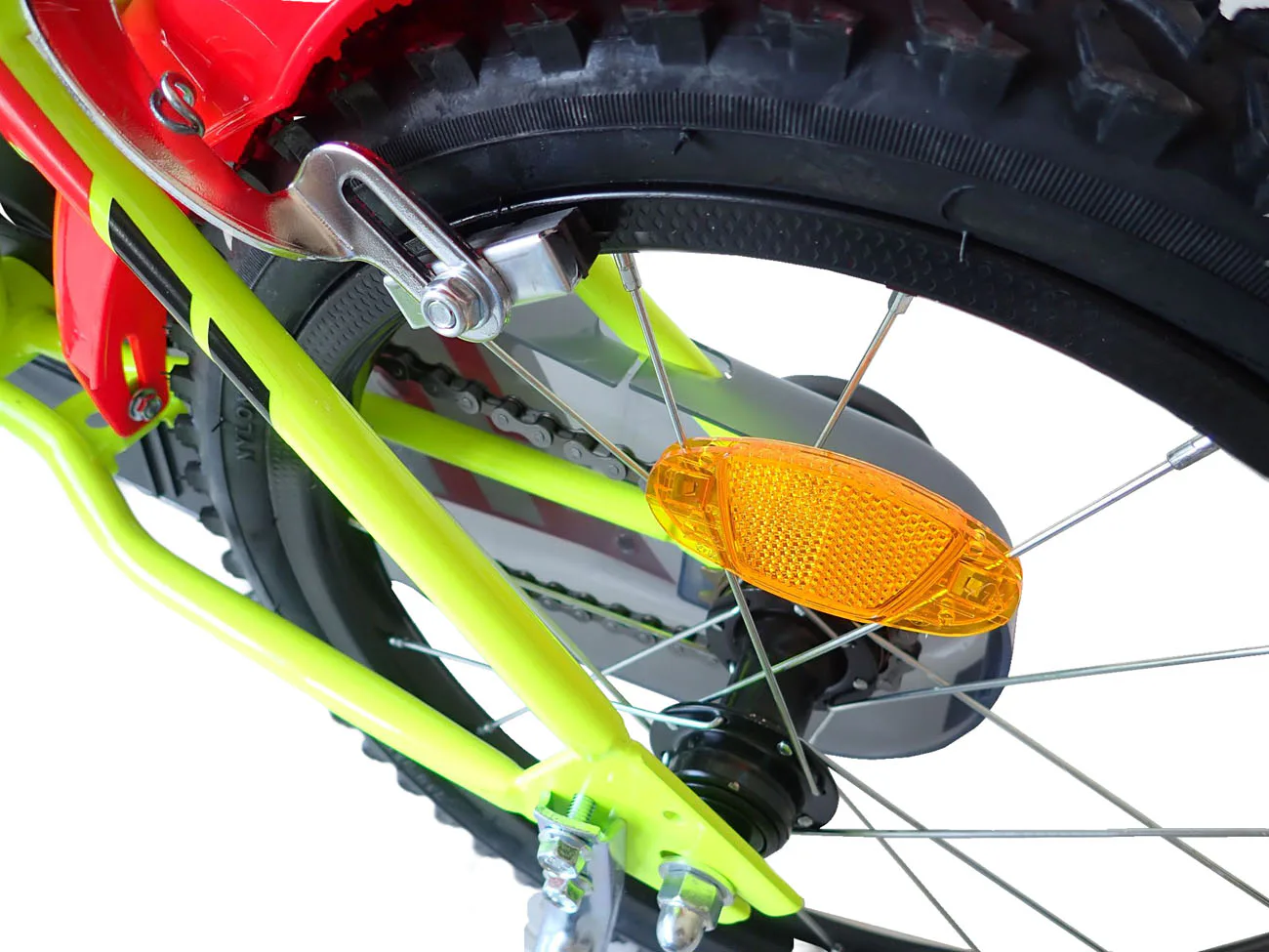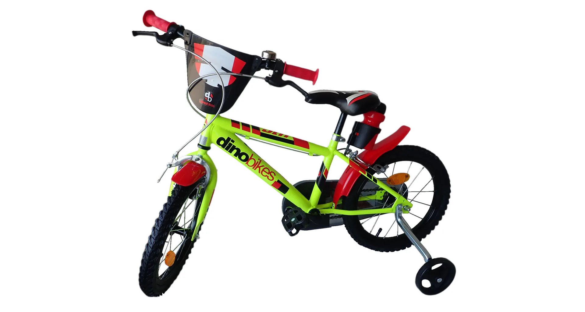 Dětské kolo Dino Bikes 416US má plastové ráfky 16" (palců = 41 cm), nafukovací pláště, volnoběh a je vybavené přední i zadní čelisťovou brzdou.