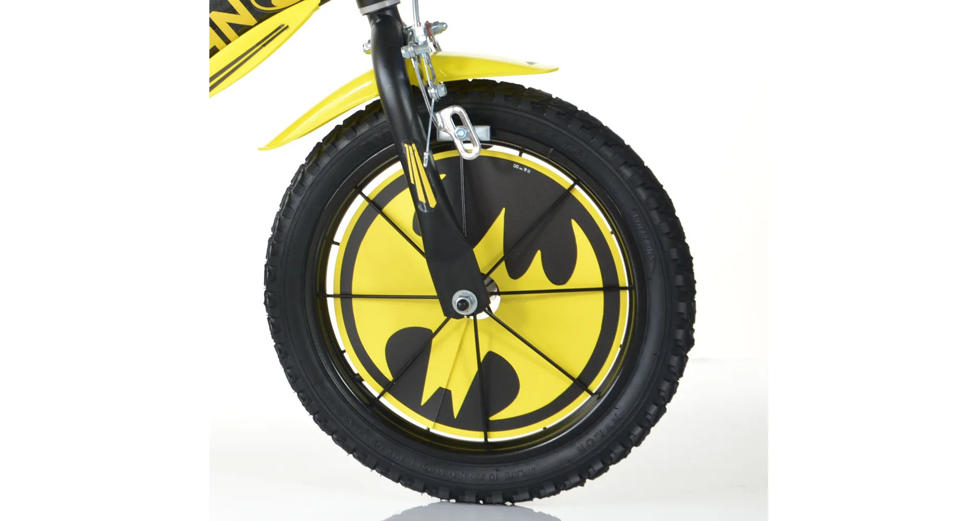 Dětské kolo Dino Bikes BATMAN má plastové ráfky 16" (palců = 41 cm), nafukovací pláště, volnoběh a je vybavené přední i zadní čelisťovou brzdou.
