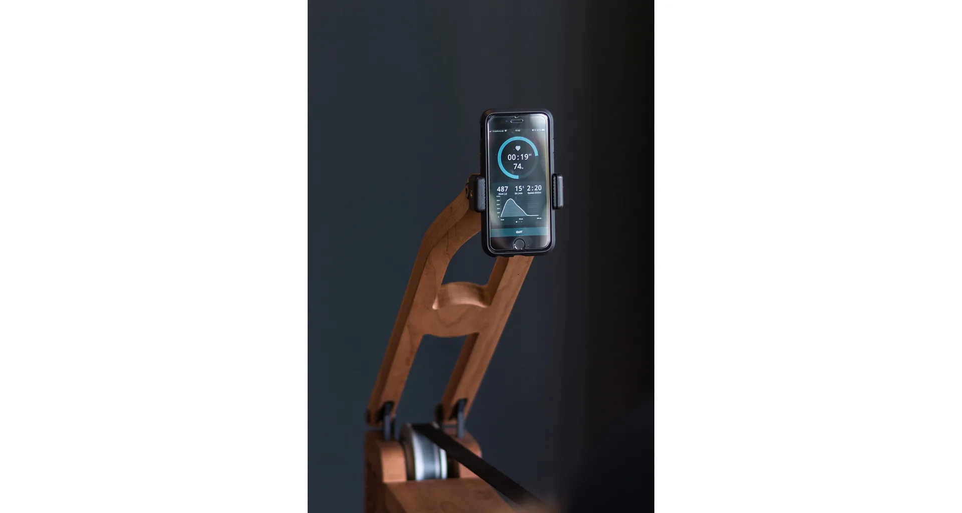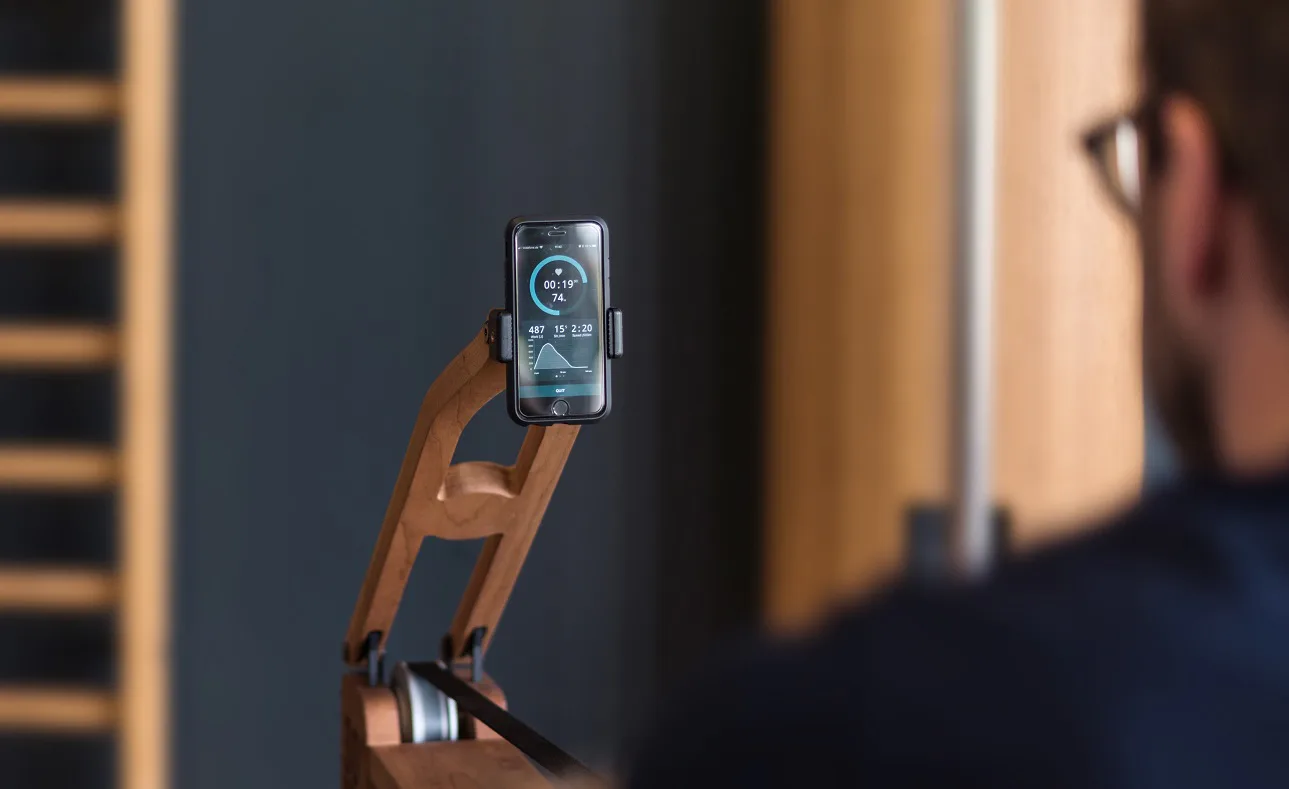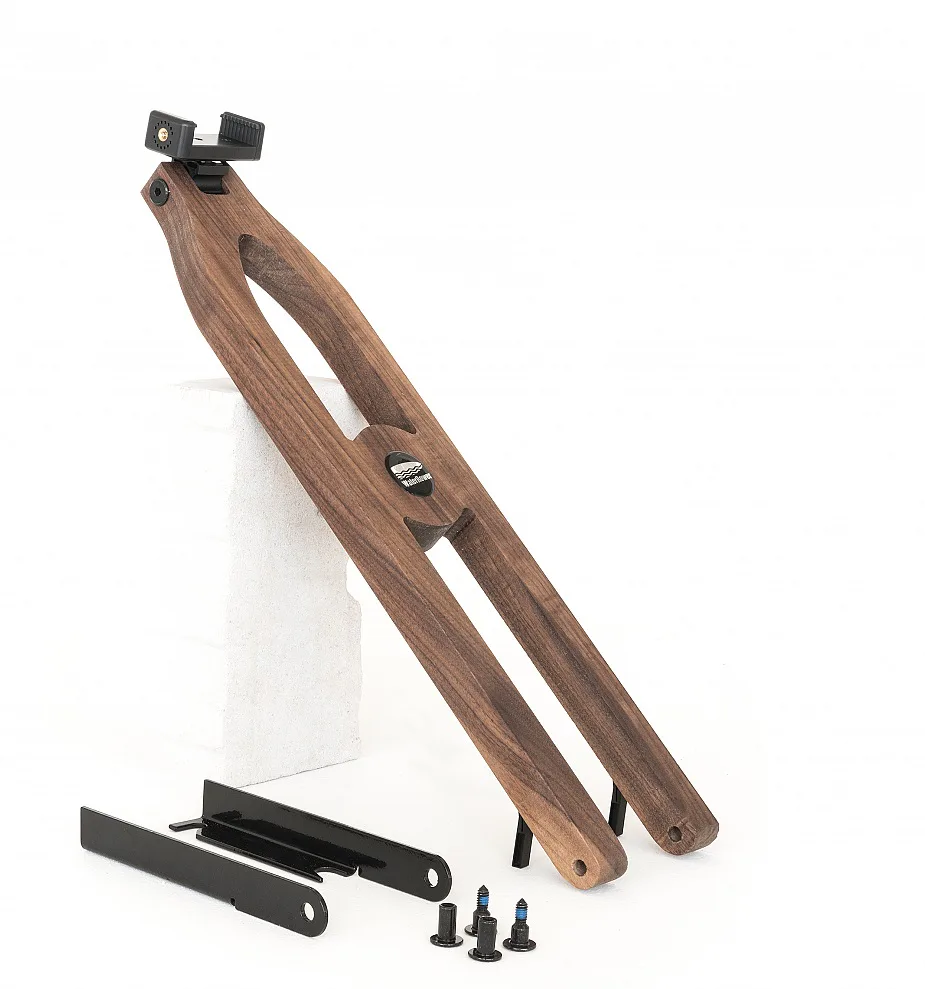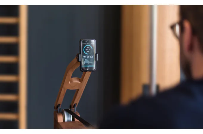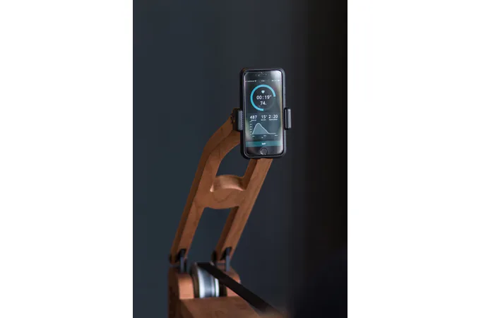 Držák smartphonu / tabletu NOHrD Tablet-Arm lze přidělat k veslovacímu trenažeru WaterRower, včetně držáku na smartphon. Držák na tablet je třeba dokoupit zvlášť. Držák lze kdykoliv snadno sklopit.