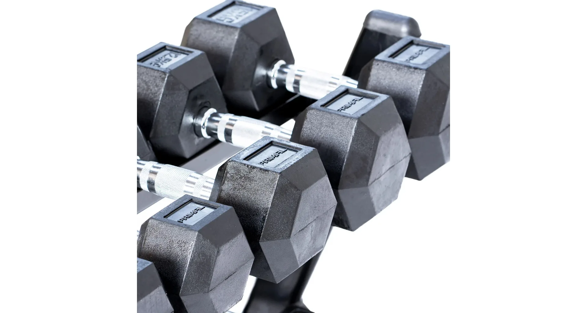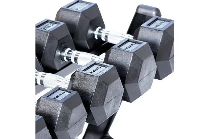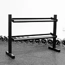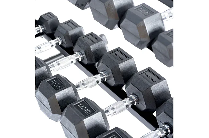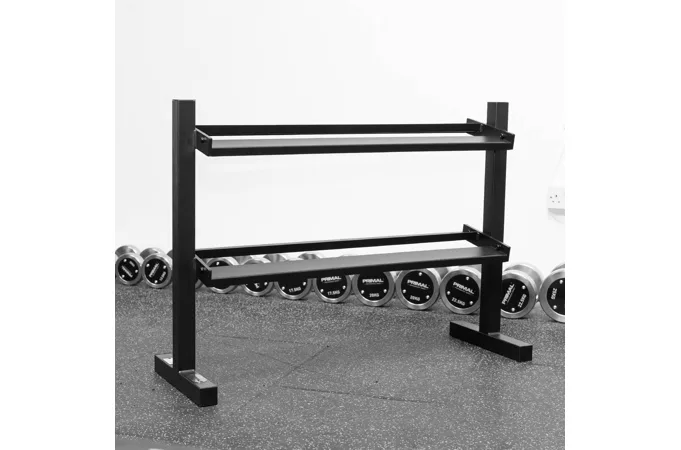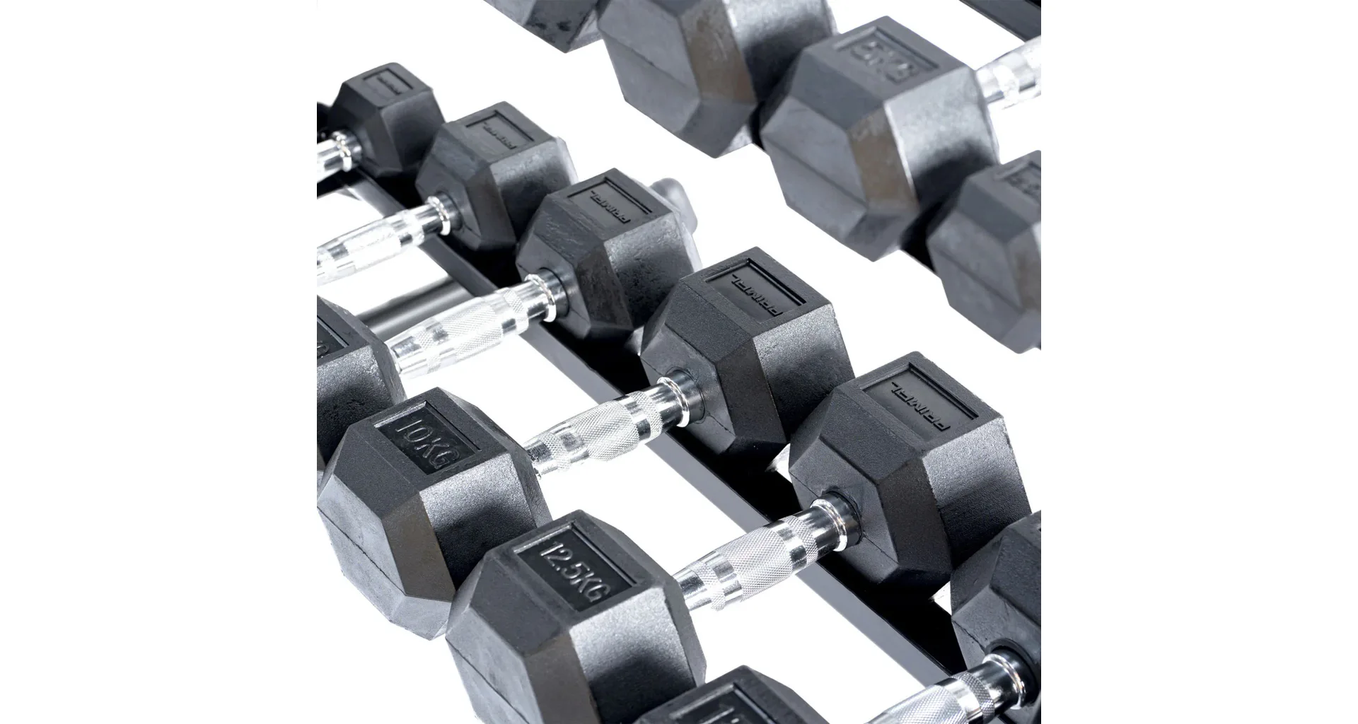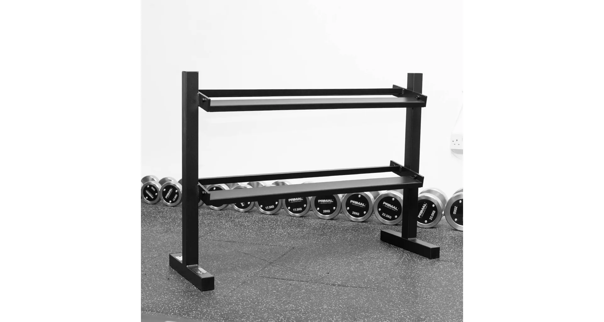 Dvouřadý stojan na hexagonální činky PRIMAL Dumbbell Rack na činky 1 až 15 kg. Dvouřadý stojan nabízí prostor pro 6 párů činek. Nejmenší a nejlehčí jsou umístěny nahoře a nejtěžší a největší ve spodní části stojanu.