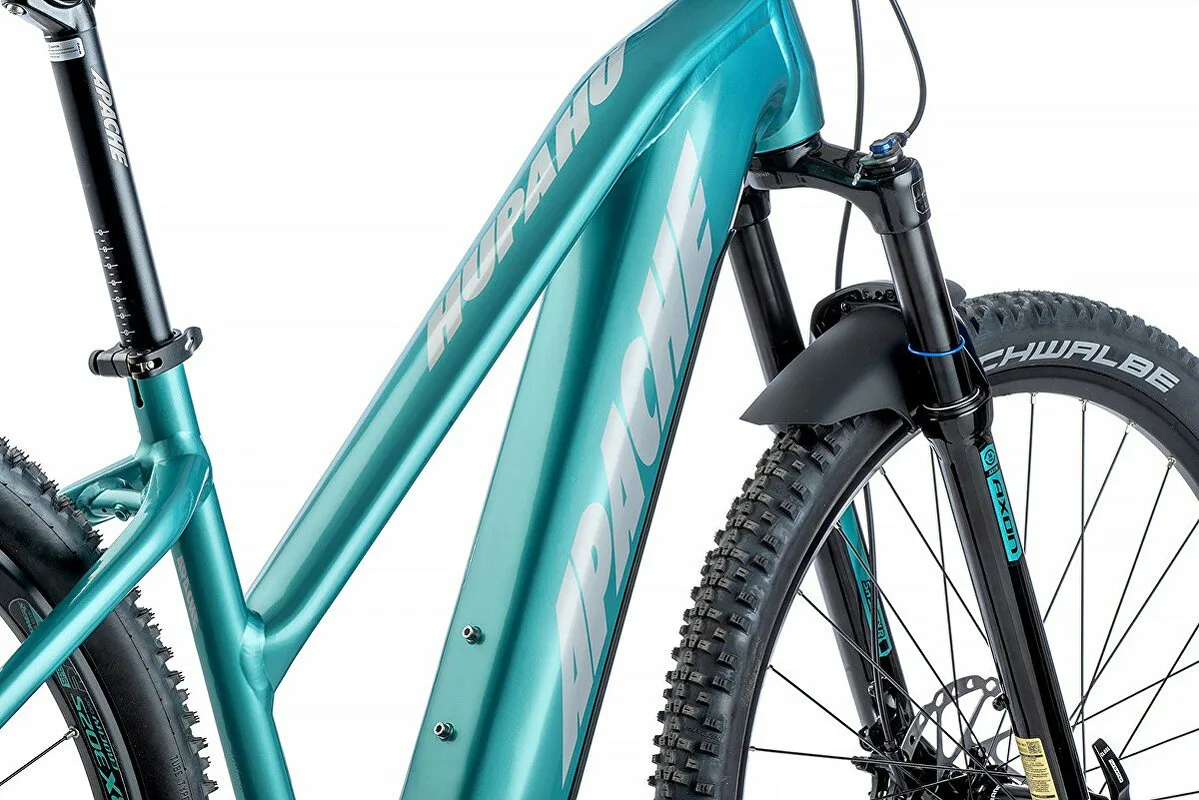 APACHE Hupahu 2 lady Bosch CX je horské elektrokolo vhodné nejen pro dámy. Hupahu je e-bike s plně integrovanou baterií v rámu kola, sportovním designem a odpruženou přední vidlicí. Kapacita baterie je 20,1 Ah (750 Wh).