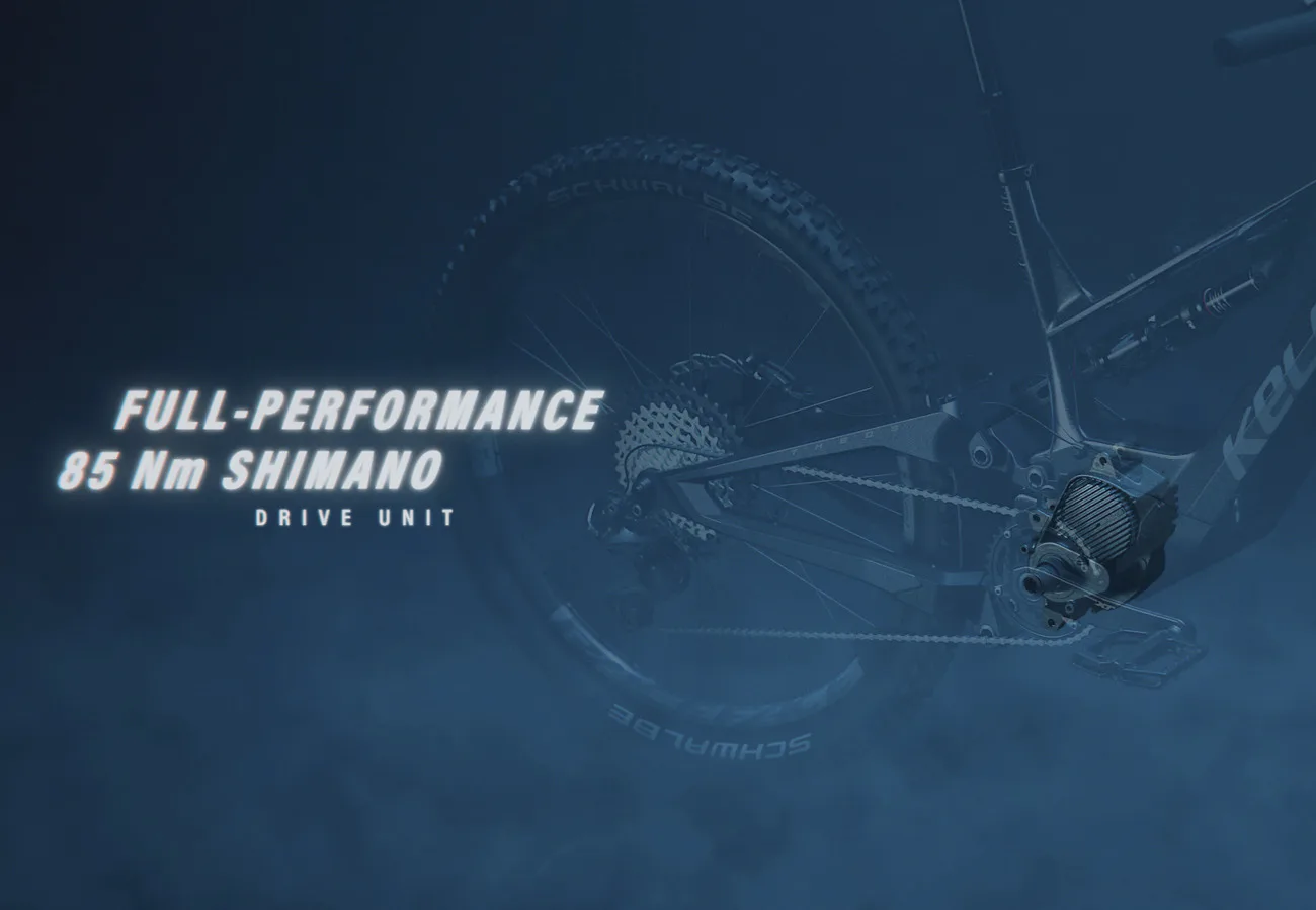 Pohon modelu KELLYS Theos F100 SH tvoří výkonný motor Shimano EP8 o nominálním výkonu 250 W. Díky použití hořčíku pro výrobu bloku motoru je váha pouhých 2,6 kg.