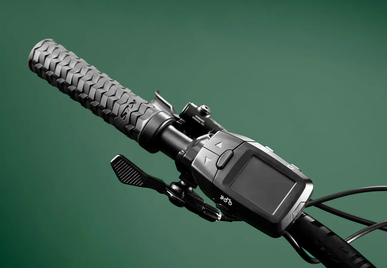 Nedílnou součástí e-biku je LCD displej Panasonic s dálkovým ovladačem z řídítek na levé straně.