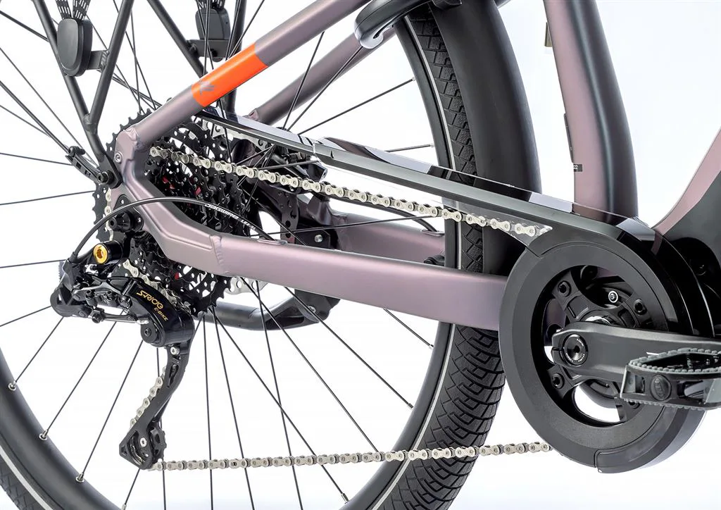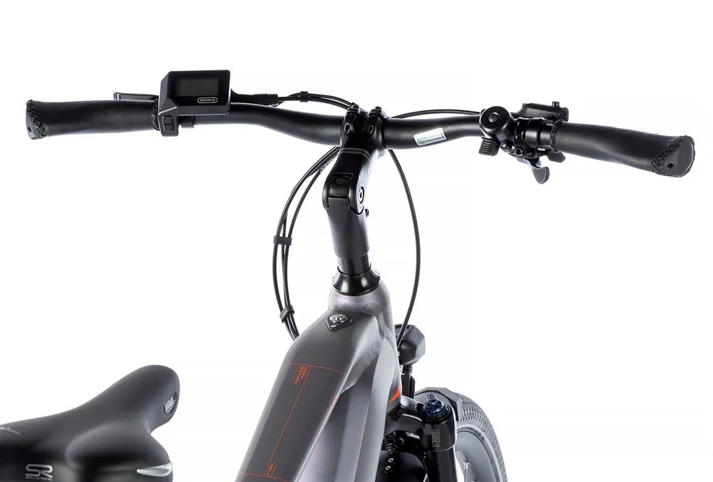 Komfort e-biku zajišťuje bohatá základní výbava s odpruženou vidlicí, kotoučovými brzdami a stabilními 28“ zapletenými koly.