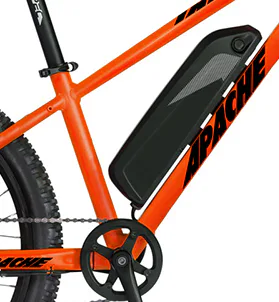 Lithium-iontová baterie APACHE Tate MTB disponuje kapacitou 13 Ah (468 Wh), LG 36 V a je umístěna na rámu kola, tam kde normálně bývá cykloláhev. Tato pozice je ideální pro vyváženost hmotnosti baterie a se zárukou dobré manipulace s kolem.