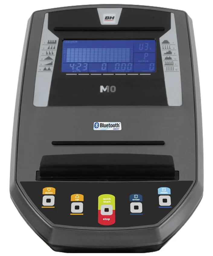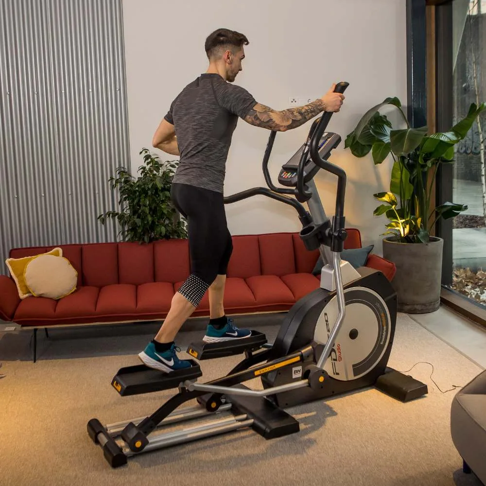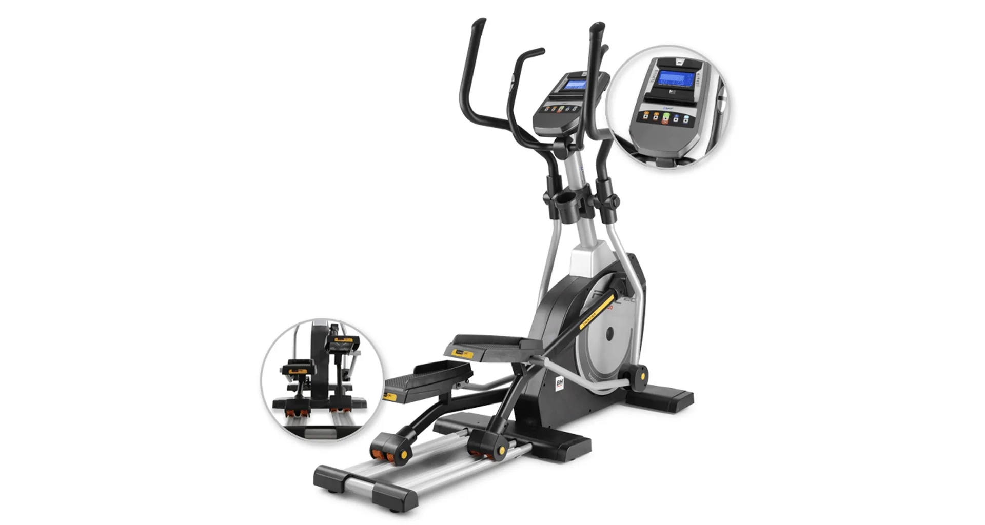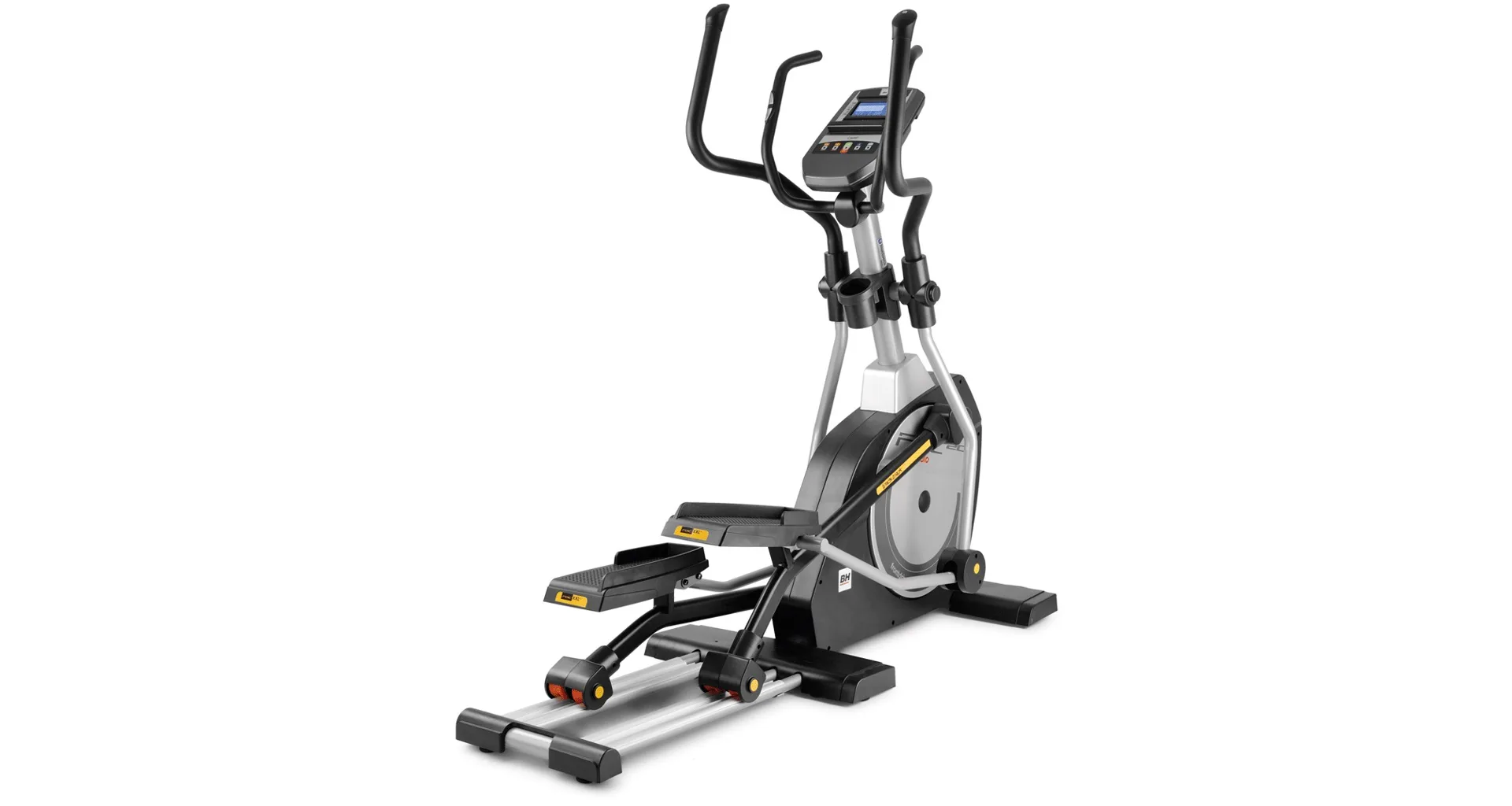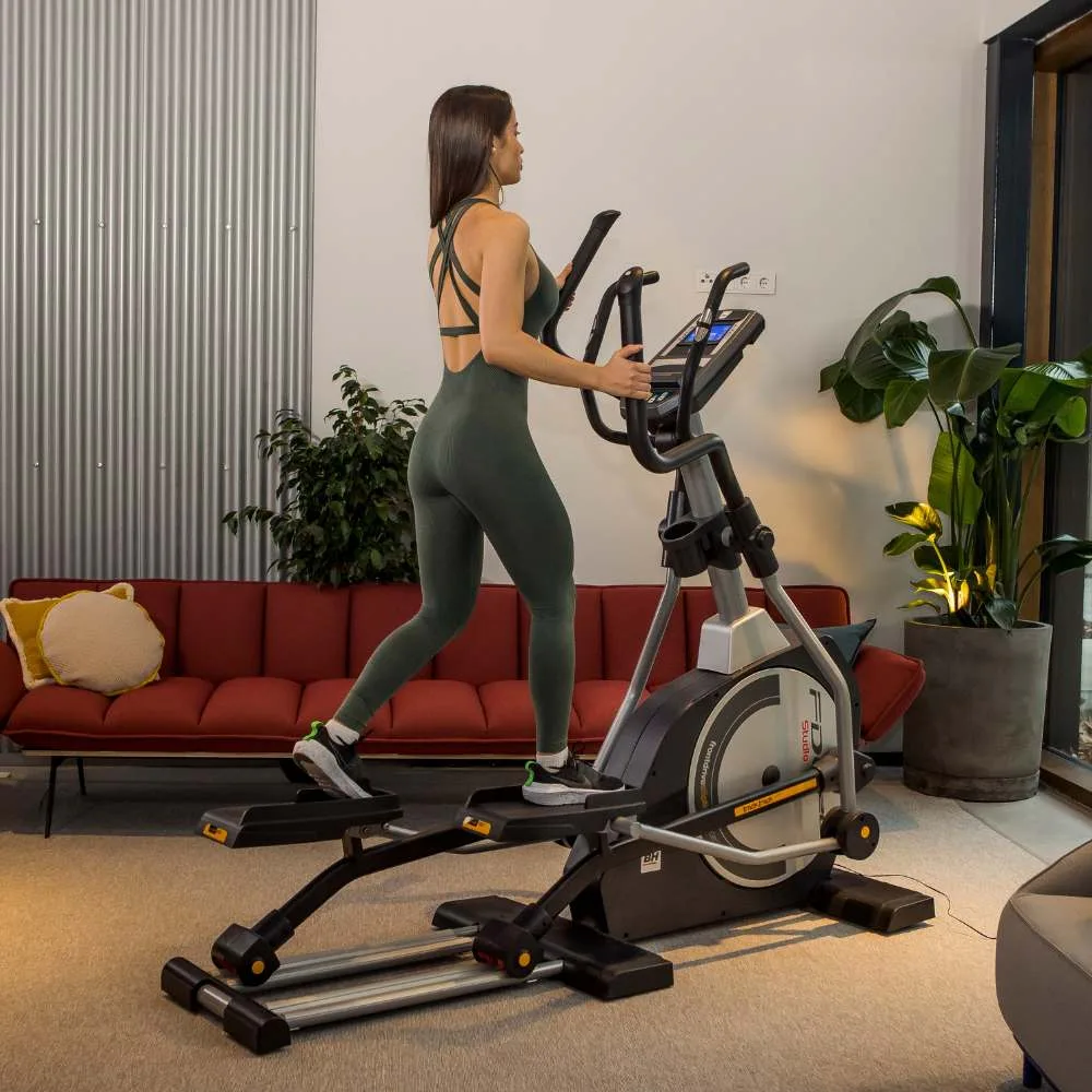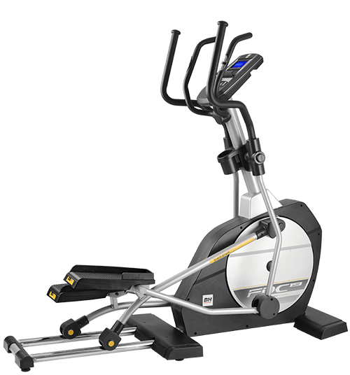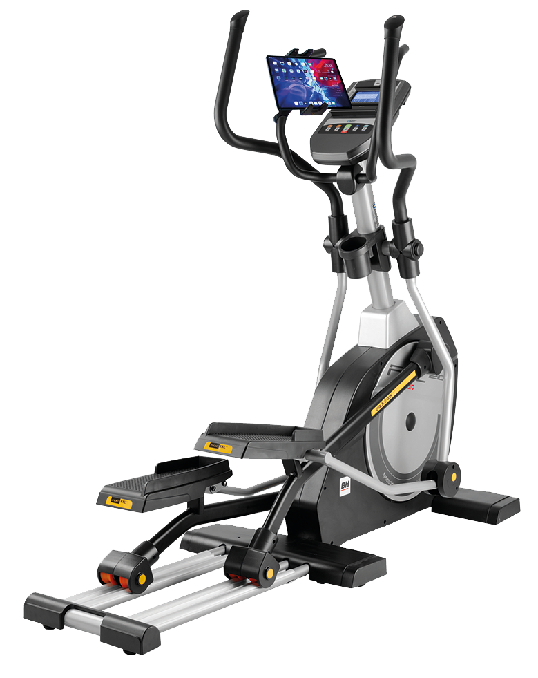Eliptický trenažér BH Fitness i.FDC20 Studio je vybaven přehledným počítačem držákem na tablet/smartphone, držákem na láhev s vodou a senzory na měření tepové frekvence, transportními kolečky a vyrovnávači nerovnosti.