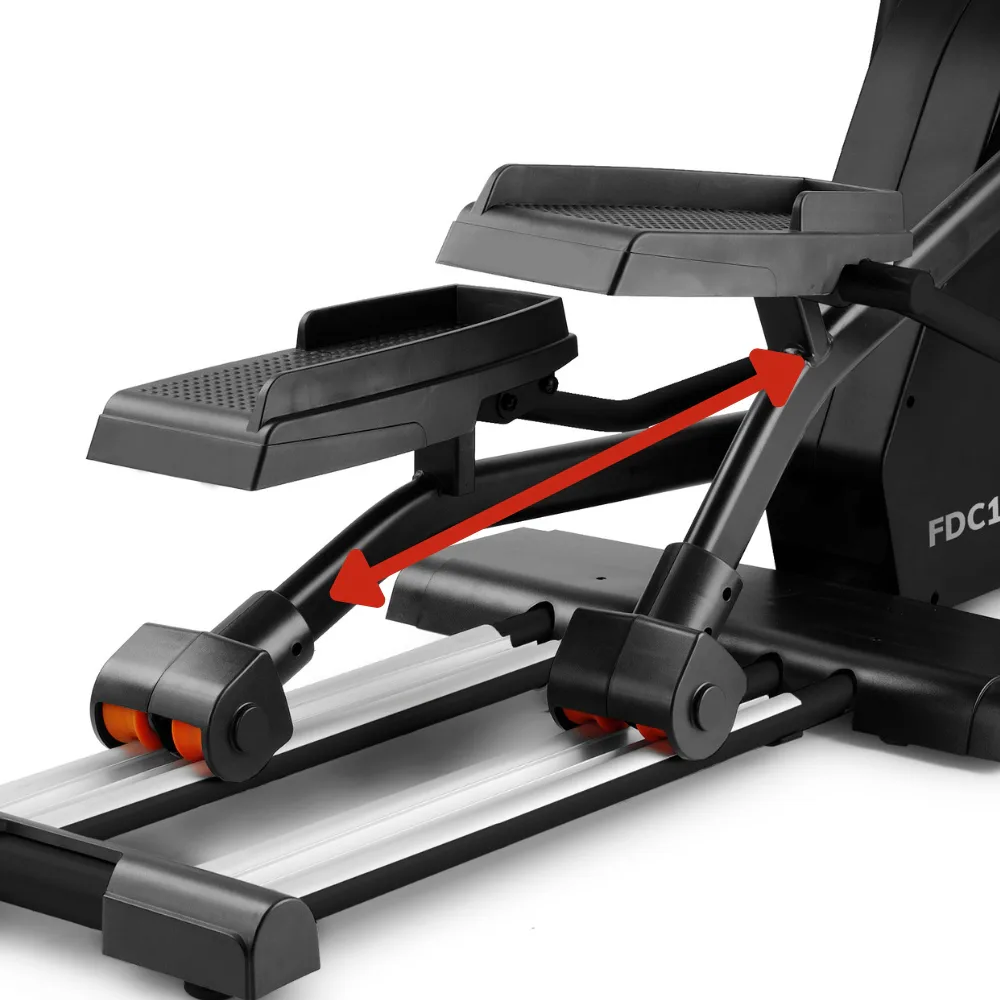Délka kroku BH Fitness i.FDC Studio je univerzální 51 cm a rozteč pedálů je 9 cm. Pedály jsou z kvalitního odolného plastu s protiskluzovou plochou. Všechny kloubní spoje jsou opatřeny průmyslovými ložisky pro dlouhodobou životnost a bez problémové fungování i při pravidelném a náročném tréninku.