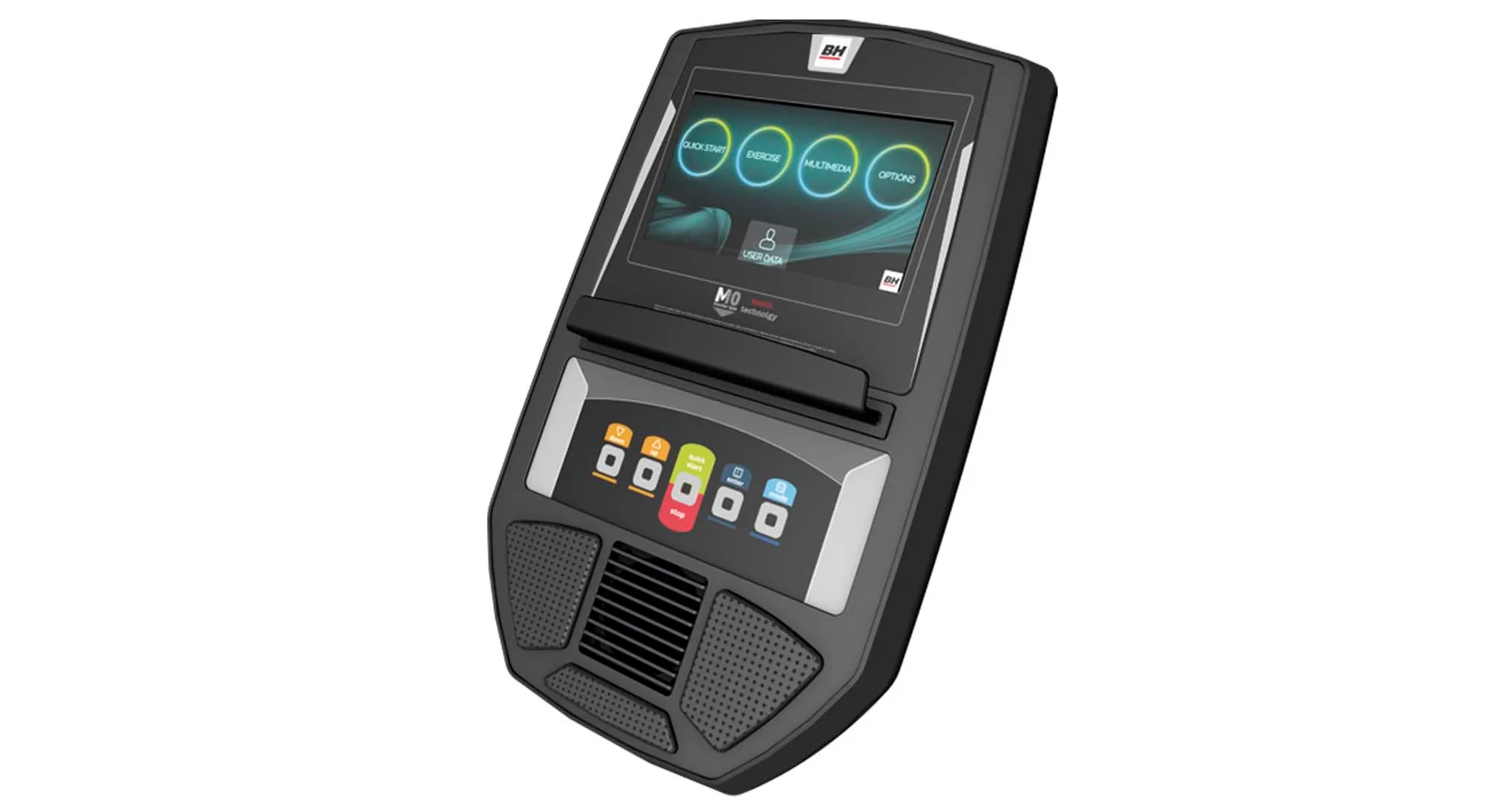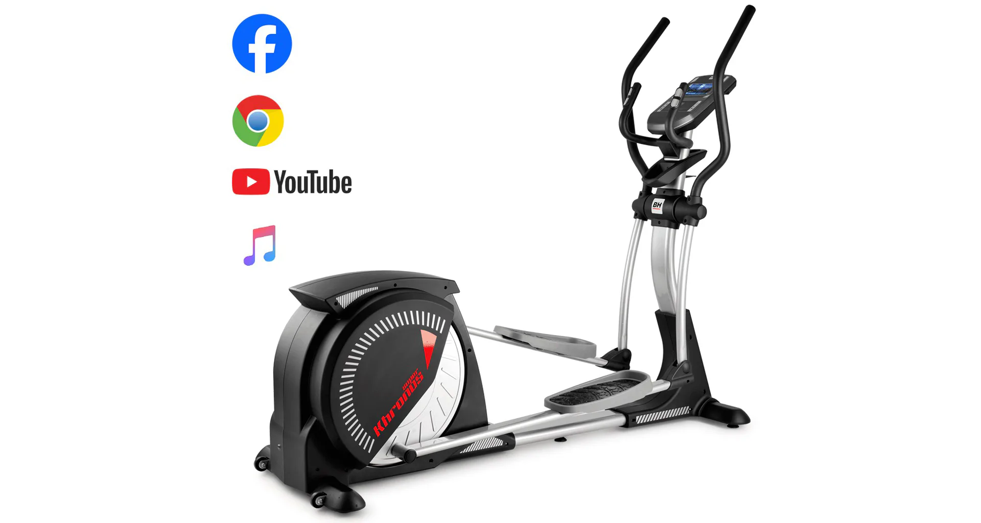 Eliptický trenažér BH Fitness Super Khronos TFT je vybaven přehledným počítačem s dotykovou obrazovkou a držákem na tablet/smartphone, senzory na měření tepové frekvence, transportními kolečky a vyrovnávači nerovnosti.