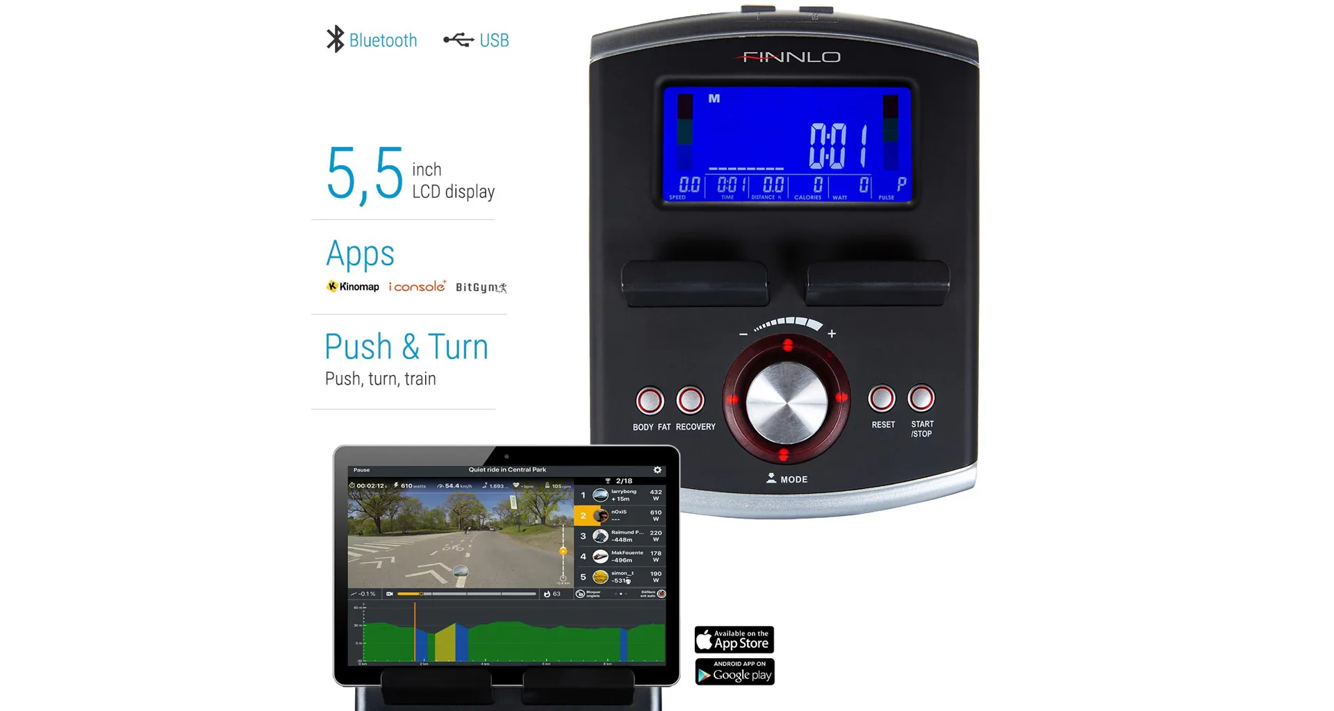 Součástí výbavy je přehledný počítač s držákem na tablet/smartphone, Bluetooth zařízením a USB portem pro nabíjení.
