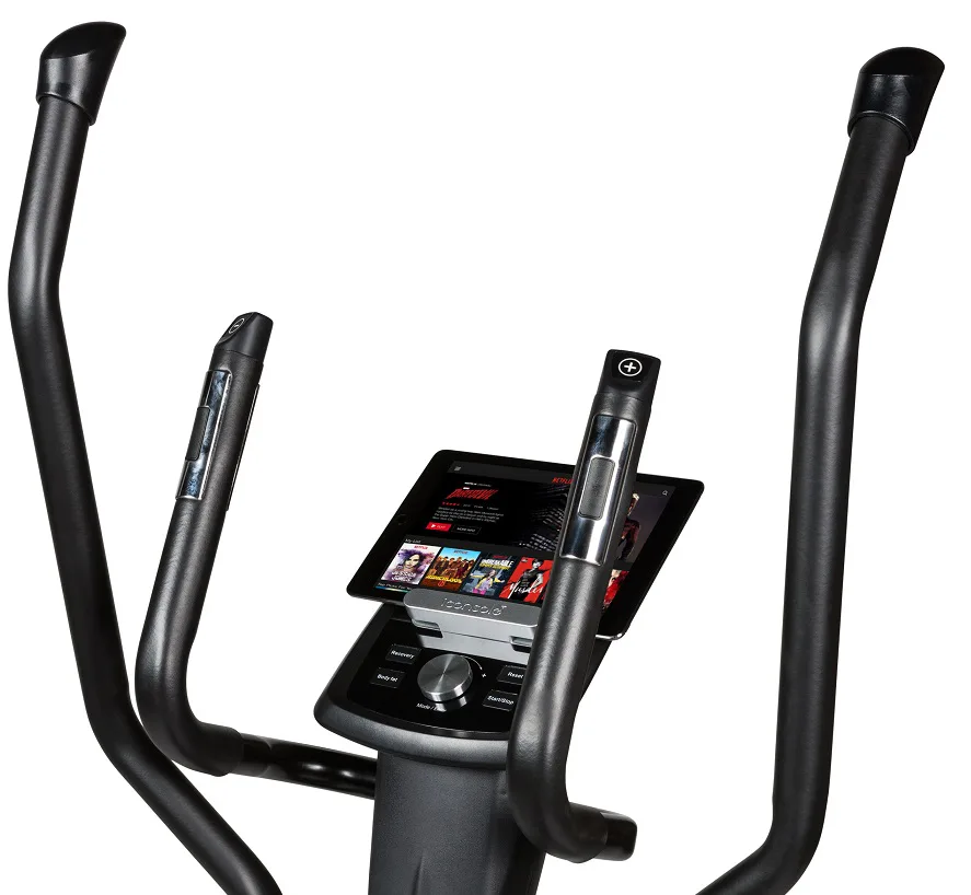 Eliptický trenažér Flow Fitness DCT2000i je vybaven přehledným počítačem s držákem na tablet, bohatou programovou nabídkou a možností využívat tréninkové aplikace pro rozmanitost tréninku. Dále jeho součástí jsou senzory na měření tepové frekvence, držák na lahev, transportní kolečka a vyrovnávače nerovnosti.