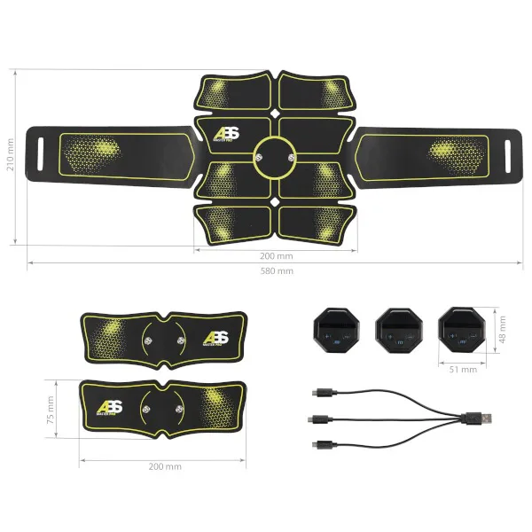 Řídící jednotka je vybavena LCD displejem, který zobrazuje aktuální režim stimulace a jeho intenzitu. Pod displejem se nachází 3 tlačítka pro změnu režimu stimulace a pro úpravu její intenzity. Jednotka umožňuje nastavit celkem 10 režimů stimulace a 20 úrovní intenzity. Vestavěná baterie se dobíjí pomocí microUSB kabelu (součástí dodávky) z běžně dostupné nabíječky. Velká elektroda na stimulaci břišních svalů má rozměry 58 x 21 centimetrů a tvoří ji 10 stimulačních ploch s gelovým polštářkem. Malé elektrody mají rozměr 20 x 7,5 centimetru a tvoří je 2 stimulační plochy s gelovým polštářkem.