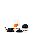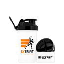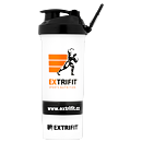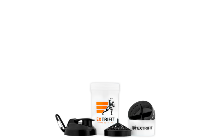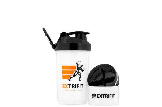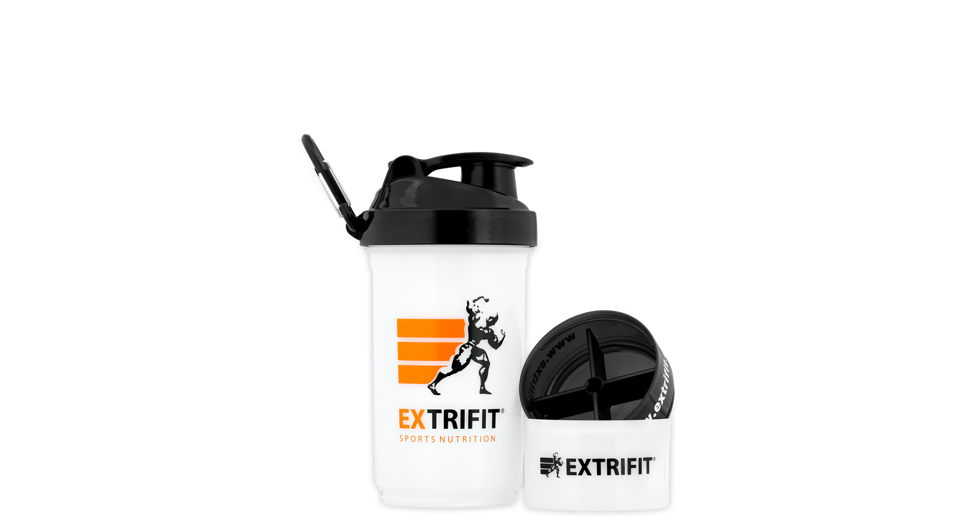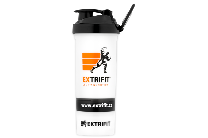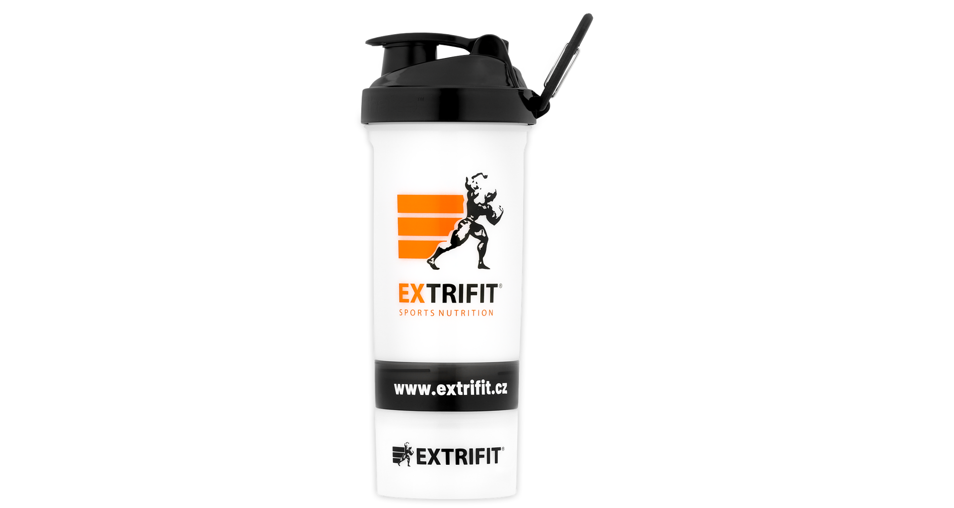 Praktický lesklý a transparentní šejkr Extrifit se zásobníky na tablety či sypké formy suplementů. Hlavní nádoba a větší zásobník jsou mléčné transparentní, uzávěr a menší zásobník jsou černé. Uzávěr je šroubovací, malé víčko zaklapávací. Plastová karabina na pověšení šejkru. Po jedné straně samotného šejkru jsou v průhledu rysky v ml/oz pro odměření objemu tekutiny (do 600 ml), šejkr samozřejmě obsahuje mřížku pro lepší rozmíchání nápoje. Vpředu a vzadu je na nádobě umístěno oranžovo-černé logo firmy Extrifit, na menším zásobníku webová adresa a na větším pak logo v černém provedení.