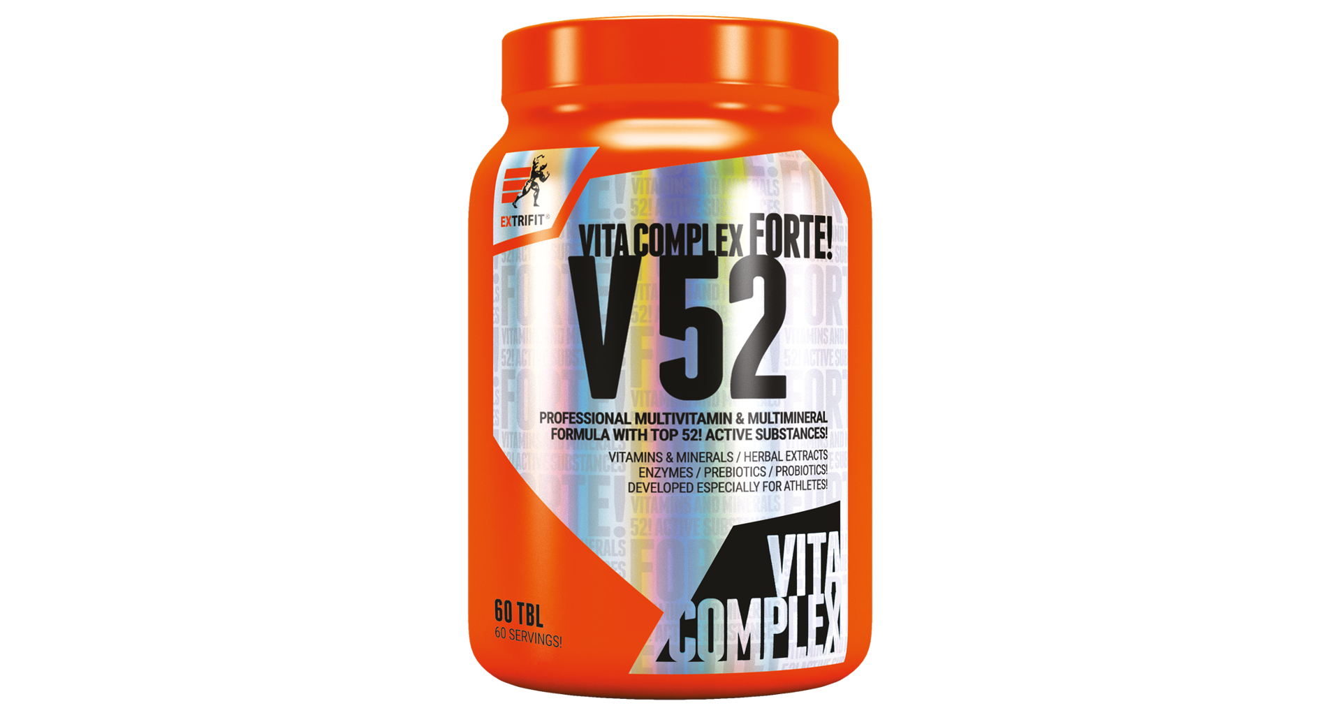 V52 Vita complex forte je profesionální multivitamínová a multiminerálová formule obsahující 52 aktivních látek vytvořená speciálně pro osoby s vysokou fyzickou a psychickou zátěží a pro výkonnostní a kondiční sportovce. Obsahuje kromě vitamínů a minerálů řadu dalších účinných látek jako adaptogeny, enzymy a probiotika, a to vše v dávkách, které uspokojí potřeby velmi náročných sportovců. Pokud usilujete o maximalizaci svalové hmoty, potřeba vitamínů i minerálů stoupá, nezapomeňte proto v takovém případě zařadit tento náš produkt do svého jídelníčku! Pokud zároveň chcete snížit podkožní tuk na minimum, oceníte obzvláště vliv V52 na funkci imunitního systému a snížení míry únavy.