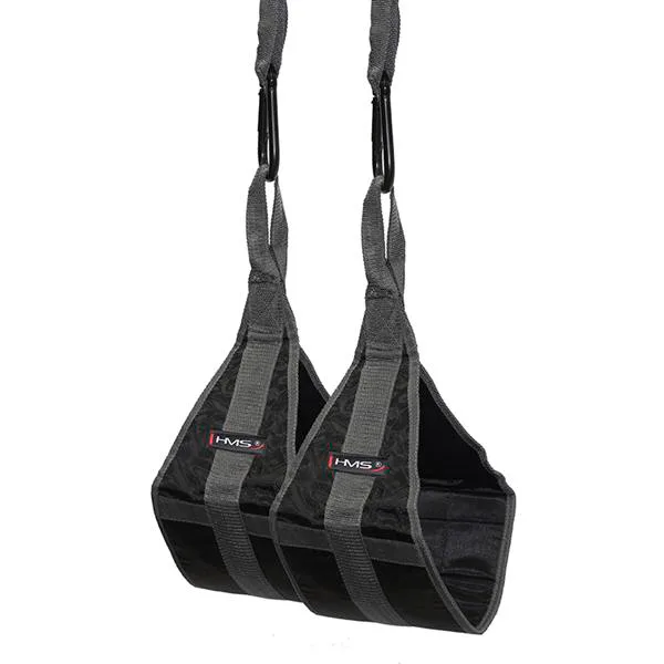 Závěsy na přednožování HMS F4438 usnadňující cvičení břišních svalů. Dodané dva rukávy pomocí karabiny zavěsíte na libovolnou tyč, poté jen provlečete paže rukávy a provádíte cvičební úkony.