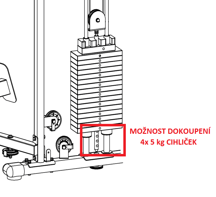 1/ Zakoupit jednu sadu závaží (4 cihličky á 5 kg) a osadit 2x 2 cihličky na každou stranu věže, celkovou zátěž tedy zvýšíte o 2x 10kg, na celkových 2x 90 kg.