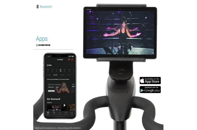 Během cvičení můžete měřit tepovou frekvenci pomocí hrudního pásu (není součástí balení). Navíc si můžete na řídítka umístit svůj smartphone, a to díky praktickému držáku, a sledovat fitness aplikace zvyšující vaši motivaci. Smartphone také můžete provázat s aplikací Inspire Fitness a sledovat reálnou trasu pro ještě mimořádnější trénink (aplikace Inspire Fitness je propojena s trenažérem a zobrazuje vám rychlost, čas šlapání, spálené kalorie, ujetou vzdálenost, frekvenci otáček atp.).